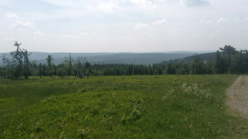 Heute führte der Weg über den höchsten und bekanntesten Berg der Gegend, den kahlen Asten. Stolze 841 Meter. Da eine Straße hinauf führt, steht da dann auch eine Gaststätte. Oben sind viele Rundwege ausgeschildert, sodass hier einiges los war. An der Größe und Belegung des Parkplatzes erkenne ich, Hauptsaison ist jetzt noch nicht. Aber der Rummel reicht auch so.