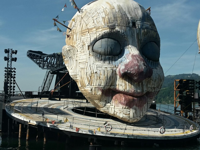 Natürlich nicht zu Fuß. Hier war die ÖBB gefragt. Leider mit ähnlichem Ergebnis wie die DB. Nur die Ausrede war neu. Wegen einer Störung eines ausländischen Unternehmens hat der Zug 30 Minuten Verspätung, aus denen dann 45 wurden. Mein Teil des Zuges wurde dann gar nicht mehr nach Innsbruck geschickt und ich bin mit einem anderen Zug eine Stunde später gefahren. Den Campingplatz Inhabern von Camping Mexico sei Dank für das längere Freihalten des Platzes, sodass ich auch um 18.30 Uhr noch ein freies Plätzchen vorgefunden habe, denn auch dieser Zug hatte am Ende 25 Minuten Verspätung.Endlich in Bregenz angekommen, begegnet einem die Seebühne fast über dem Bodensee schwebend. Mit einem tollen Bühnenbild, denn die Festspiele beginnen demnächst.