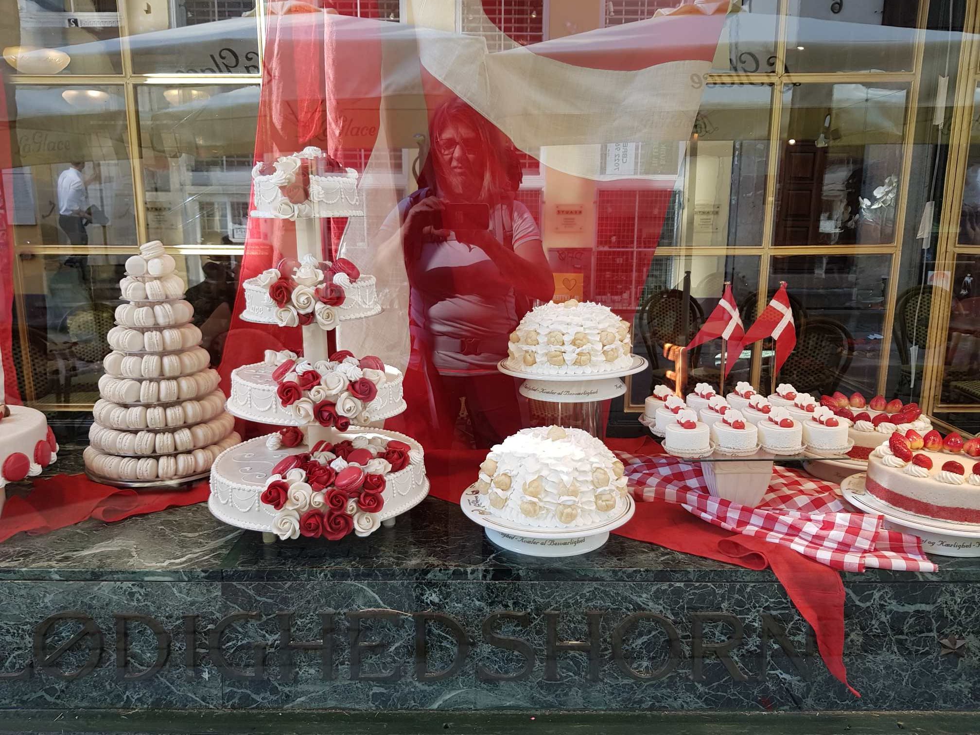 Nach einem gemütlichen Frühstück in der Fußgängerzone von Kopenhagen machen wir uns auf den Weg zur Anlegestelle unserer Fähre. Auch der Konditor ist patriotisch.