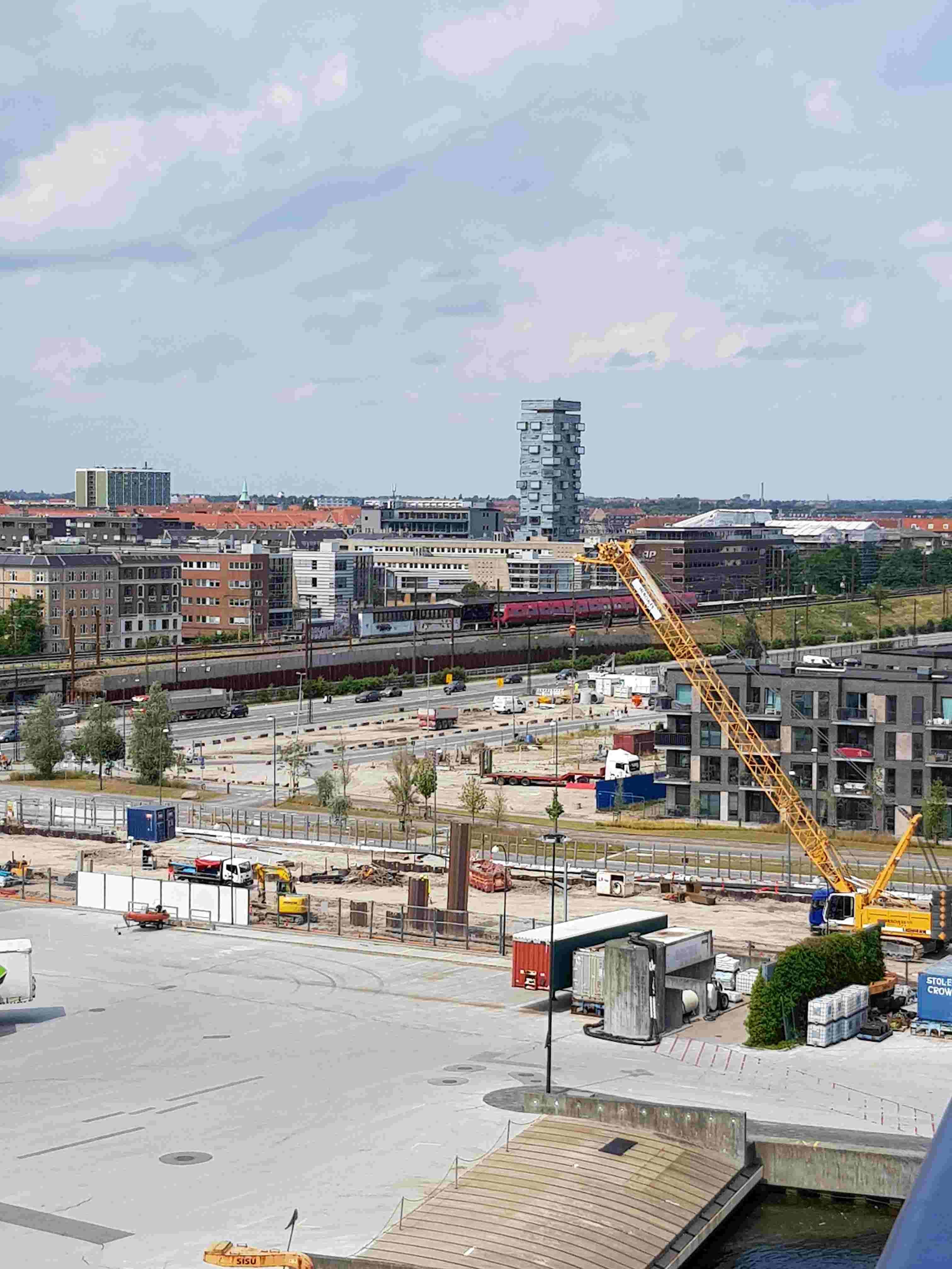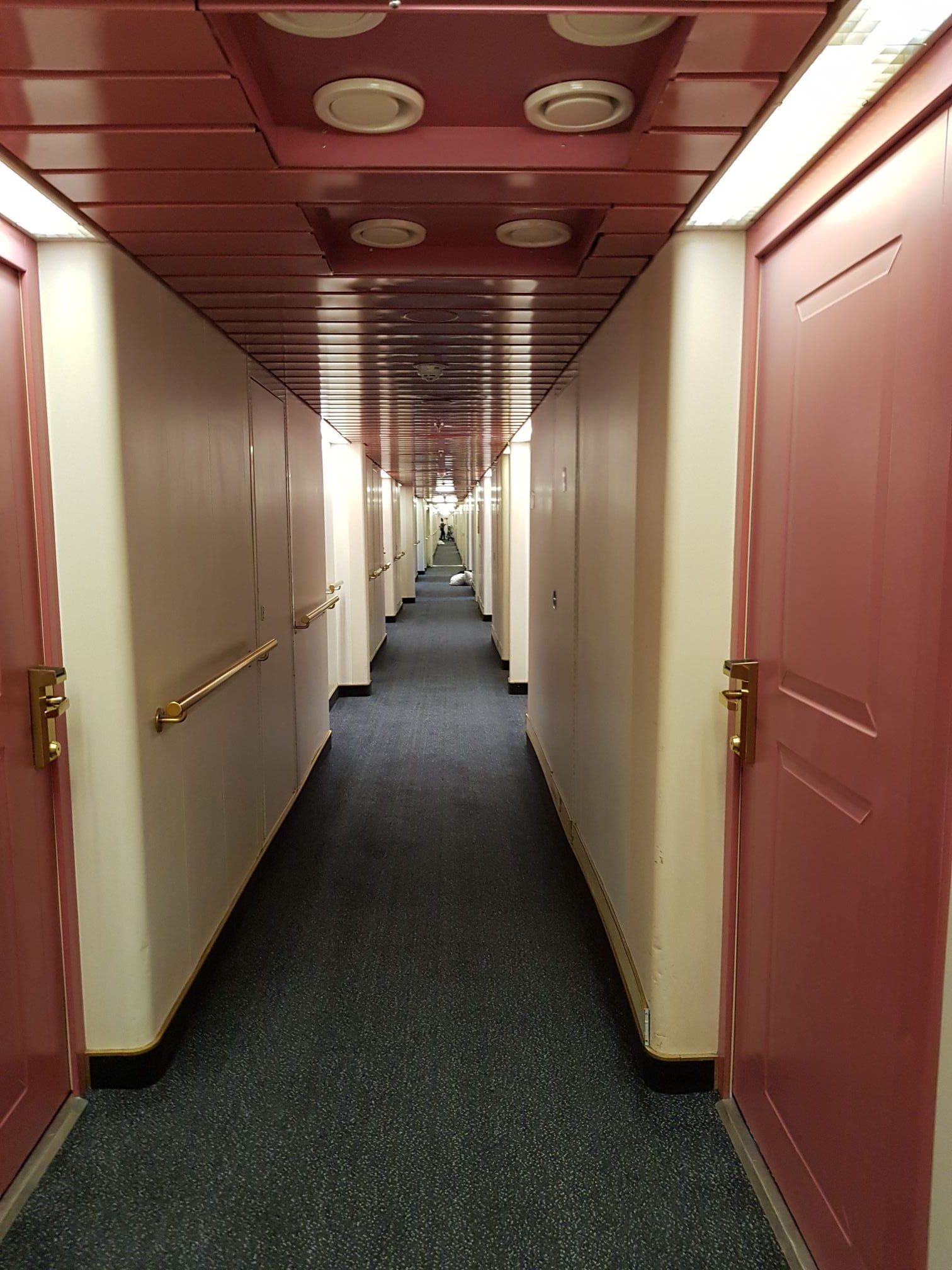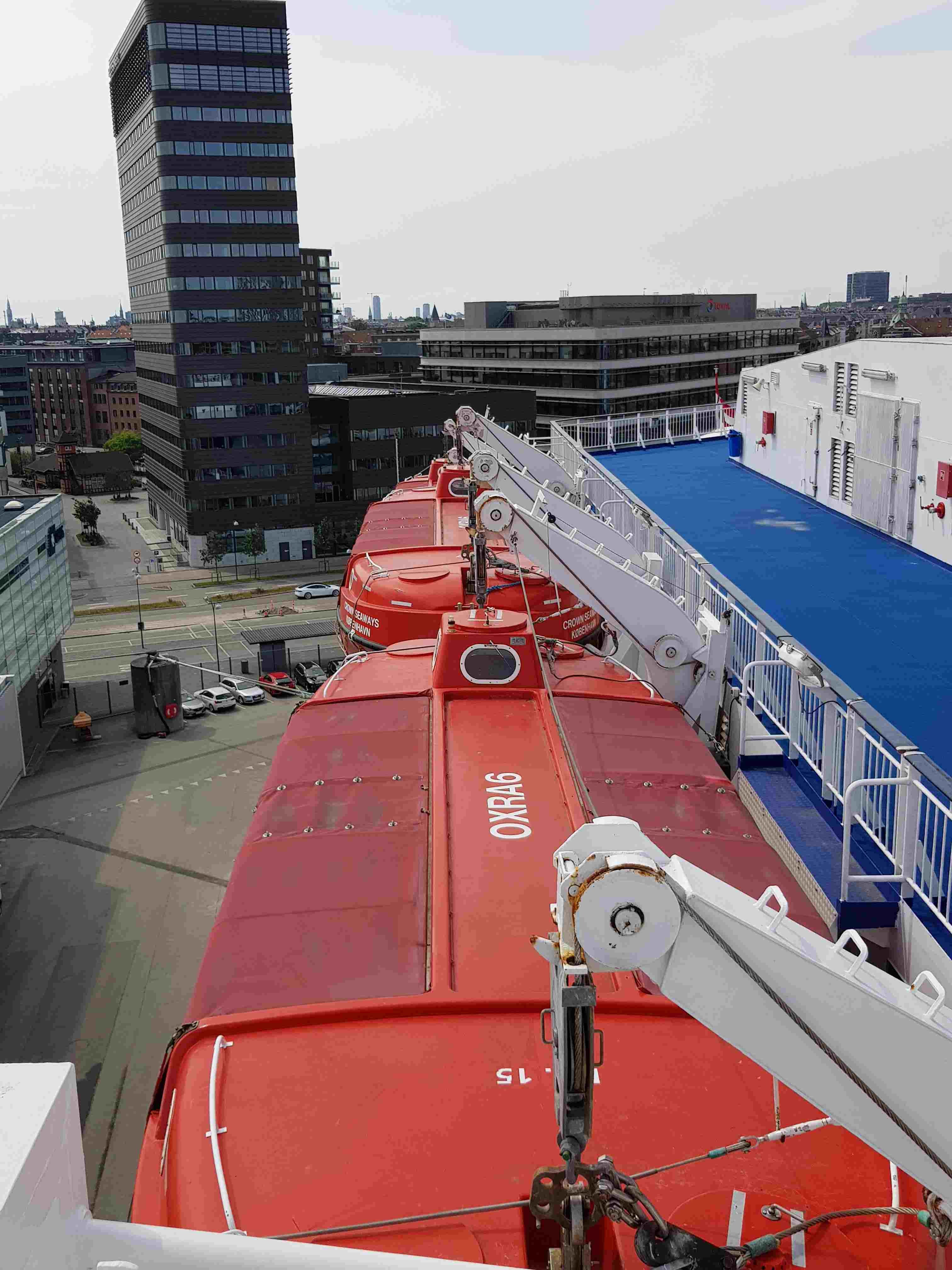 Das Schiff in seiner ganzen Pracht können wir leider nicht sehen aber die Höhe lässt sich erahnen. Der obere Teil ragt über das Haus hinaus. Für uns ist das die erste längere Schiffsfahrt, immerhin 19h.