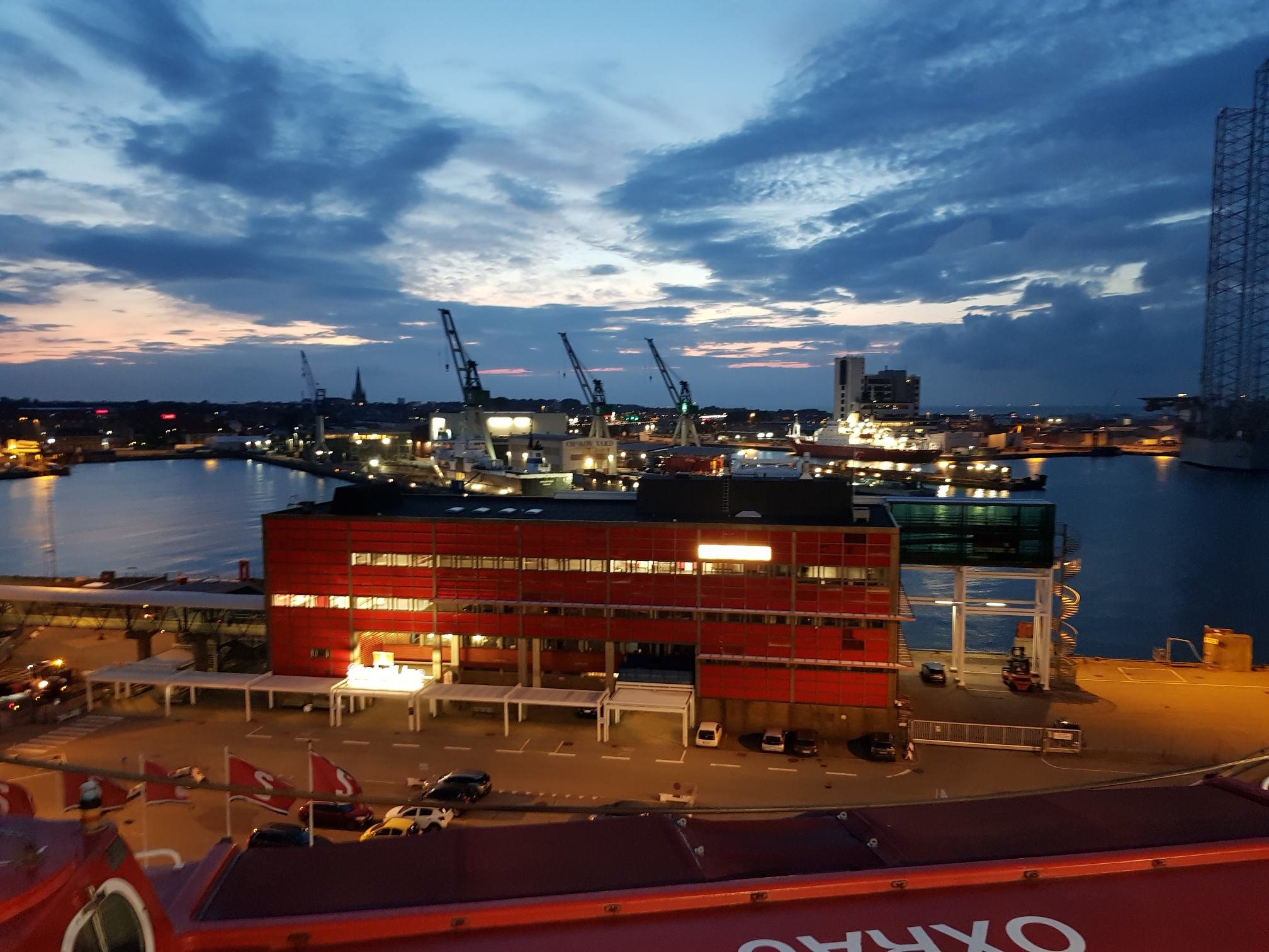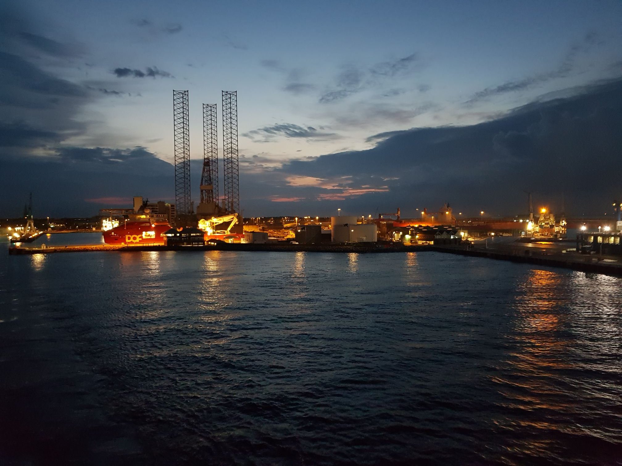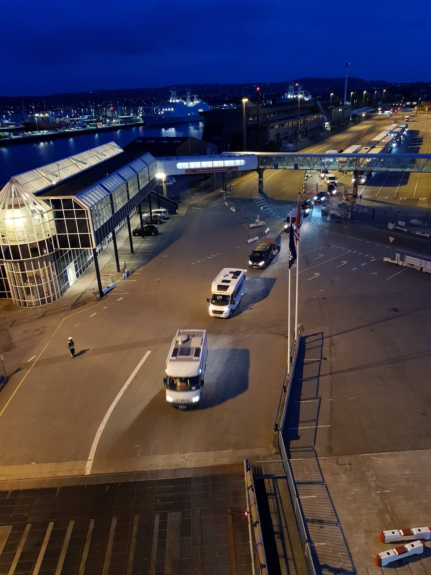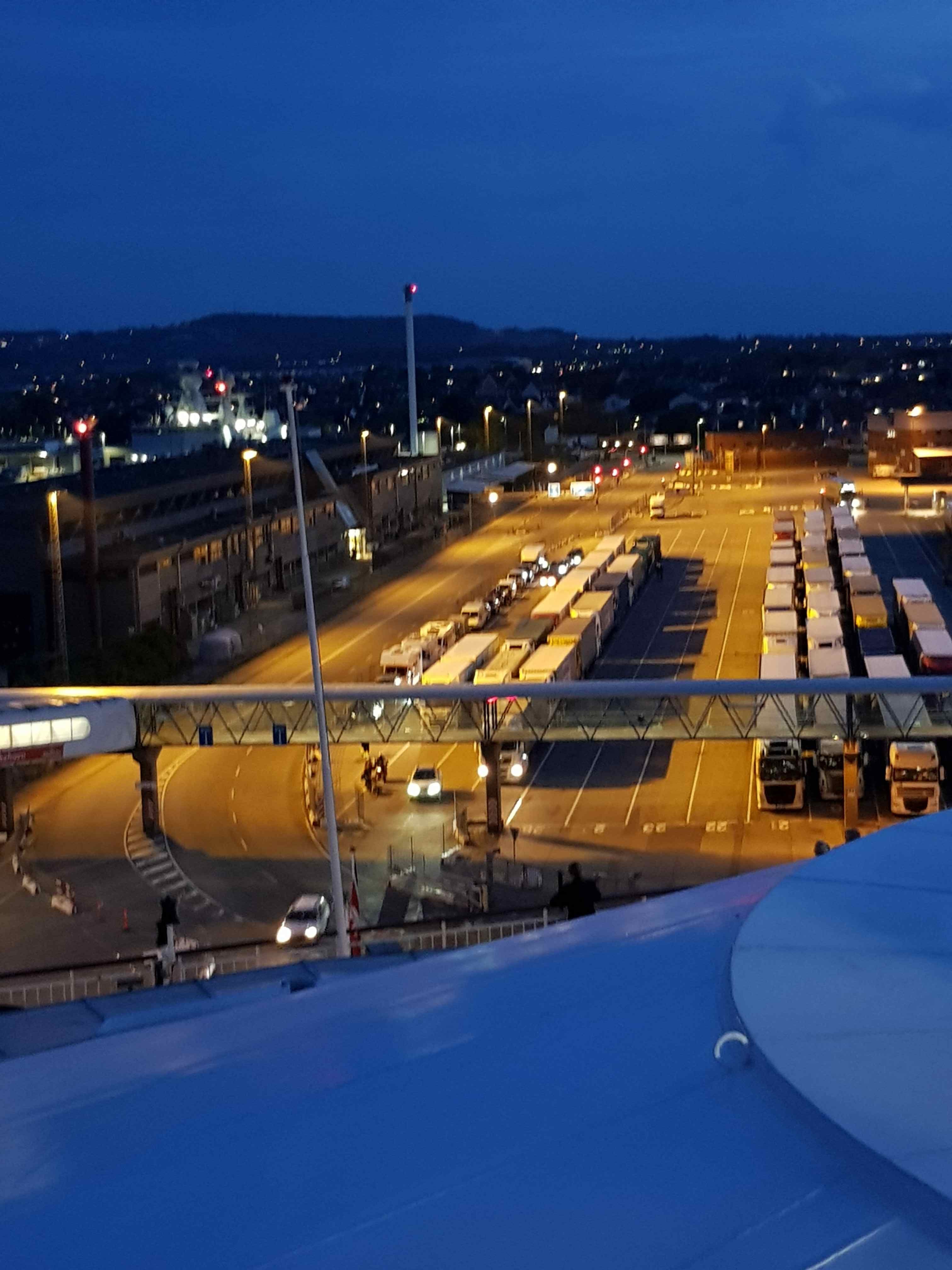 Abends um 23.00 Uhr kommen wir am nördlichsten Punkt von Dänemarks Festland an. Das „einparken“ im Hafen mit so einem riesigen Schiff ist sehr beeindruckend und muss zentimetergenau passen. Viel Platz ist nicht. Dort fahren dann viele Autos, Wohnmobile und vor allem Lastwagen an Board sogar ein voll bepackter Radler ist dabei. Man kann es kaum glauben was alles im Bauch des Schiffes Platz hat.