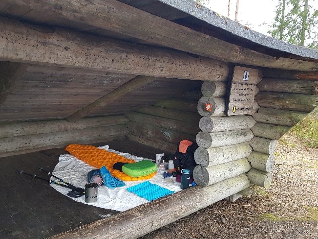 Heute schlafe ich in einem Unterstand am See mitten im Wald. Der Wind bläst immer noch ordentlich und für das Zelt findet sich einfach keine einigermaßen ebene Fläche. Bin gespannt wie es wird.