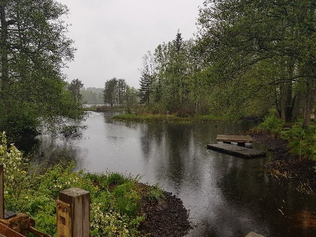 Tatsächlich regnete es die Nacht durch und in der Früh gleich weiter. Als Notfallplan hatte ich mir gestern schon überlegt nur bis zum nächsten Unterstand in ca 12km Entfernung zu laufen. Dort ist wenigstens ein festes Dach vorhanden und oftmals die Möglichkeit eine Leine zu spannen um die nassen Kleidungsstücke zu trocknen bzw. zumindest abtropfen zu lassen. Irgendwie hatte ich keine Lust auf Frühstück. Der Gaskocher soll ja nicht bei geschlossenem Zelt betrieben werden und im Regen, darauf hatte ich keine Lust. Also habe ich meine restlichen Nüsse verspeist, kaltes Wasser getrunken und inzwischen einigermaßen gekonnt, alles was trocken war auch trocken eingepackt. Nasses Aussenzelt extra und schon gings los. Es ist bis jetzt immer nur mittelmäßig starker Regen, es schüttet nicht. Natürlich kam heute meine volle Regenmontur, also Regenhose statt normaler Hose + Jacke zum Einsatz. Die Wege wie erwartet ziemlich matschig und die Holzplanken sehr rutschig.