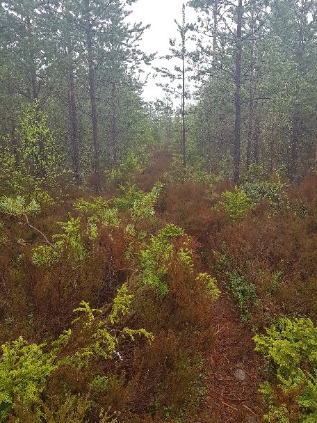 Durch solch dicht stehendens bis zum Oberschenkel hoch reichendes Heidekraut musste ich mindestens 2km lang incl jeder Menge Matschlöcher. Die Hose hat dicht gehalten, die Schuhe, vor allen Dingen der Rechte, haben es nicht geschafft.