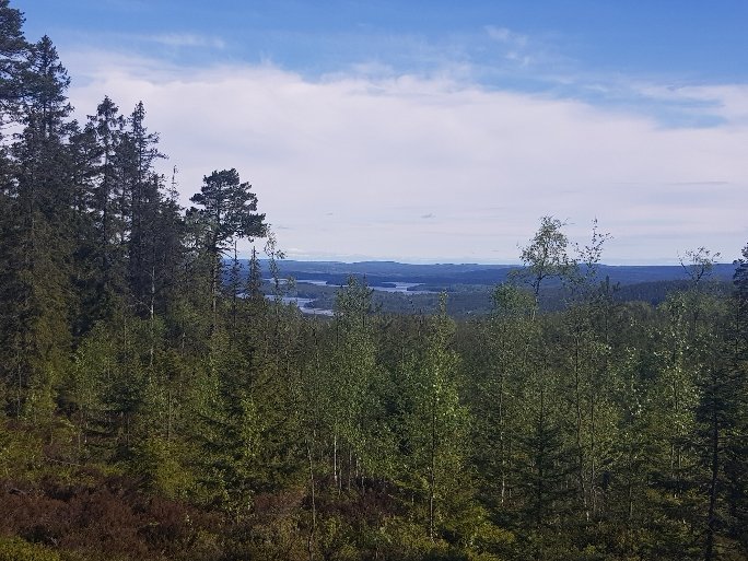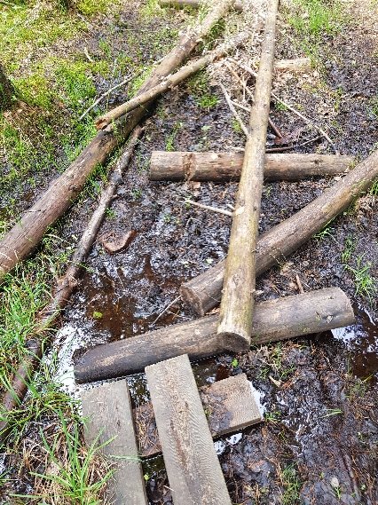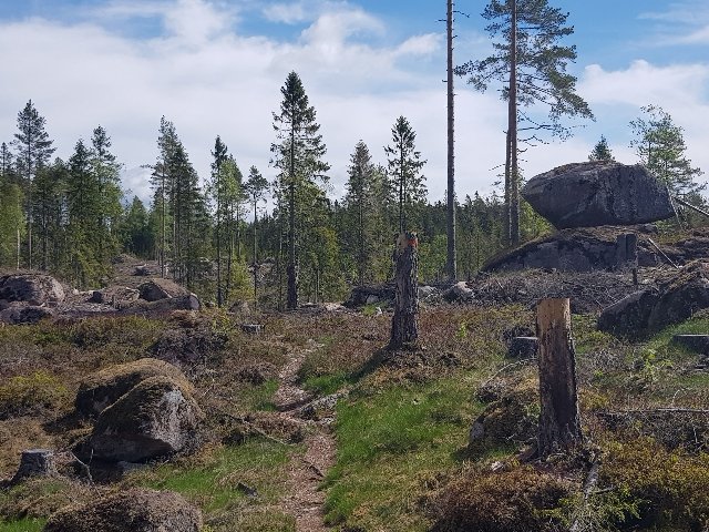 Na ja, von der Karte her wusste ich. Da muss ich runter und drüben wieder hoch. Die meiste Zeit auf den abgeholzten Flächen. Auf der Sonnenseite waren schon viele abgetrocknete Bereiche, aber der Rest, großflächige tiefe Wasserlöcher. Die Schuhe wurden nass aber bei mir ging nichts durch. Die 3 Tage mit nassen Socken und Schuhen haben mir nämlich die ersten Blasen beschert, der Ruhetag hat nicht ganz gereicht für die komplette Abheilung.