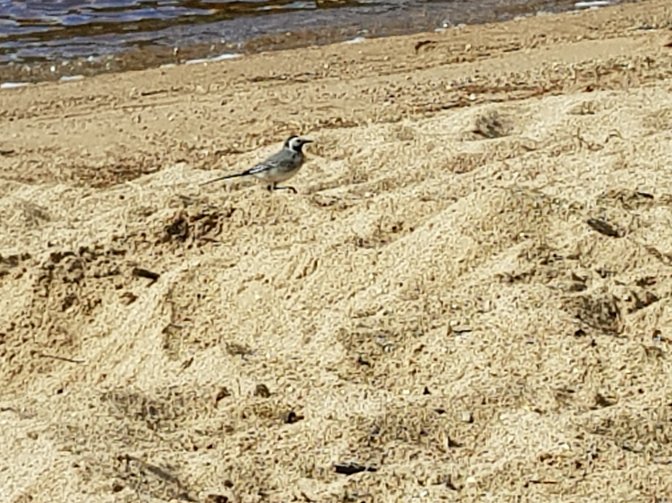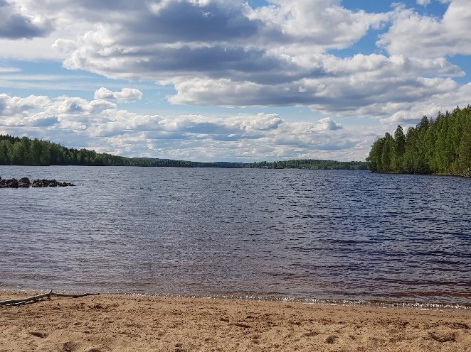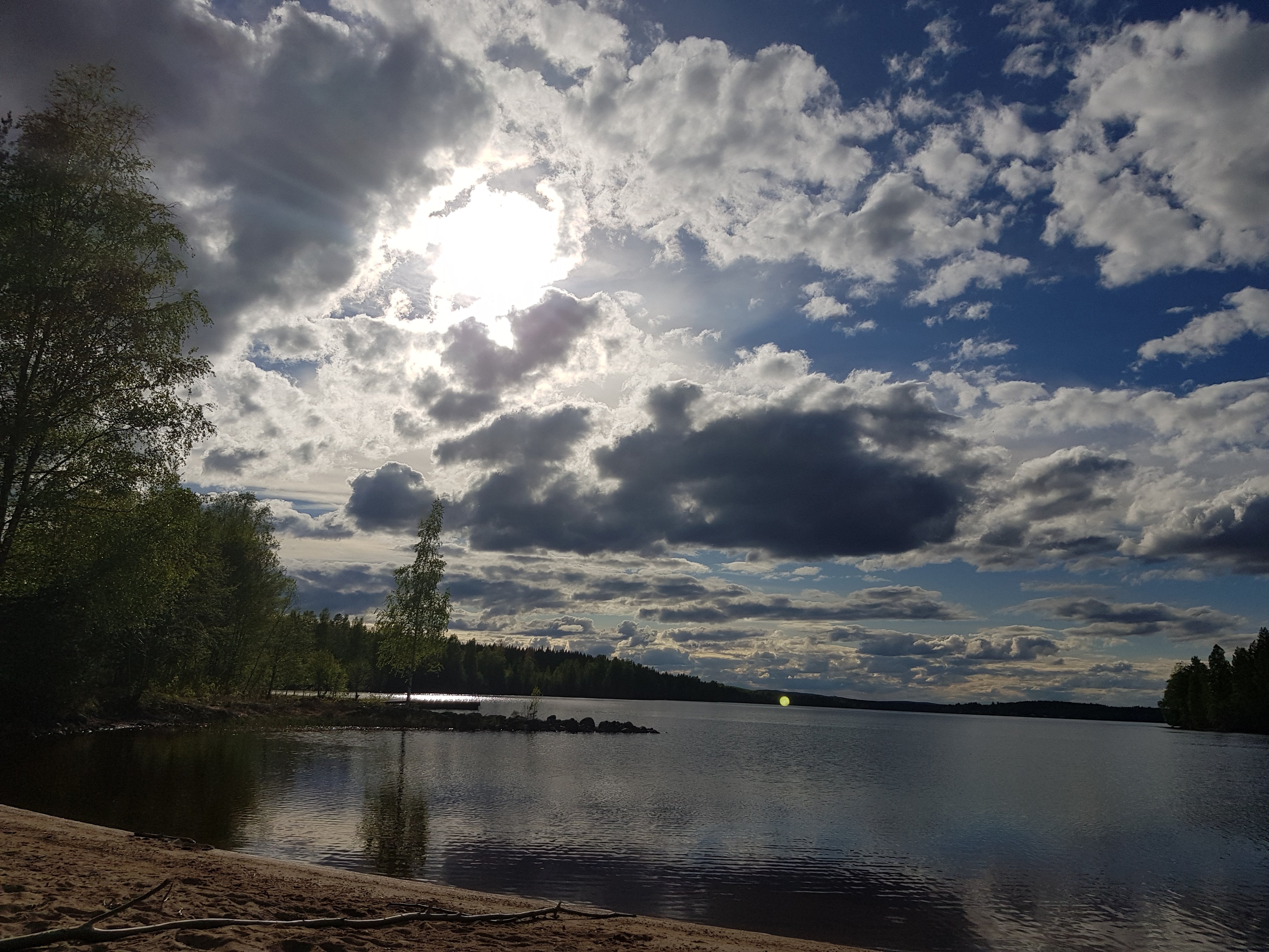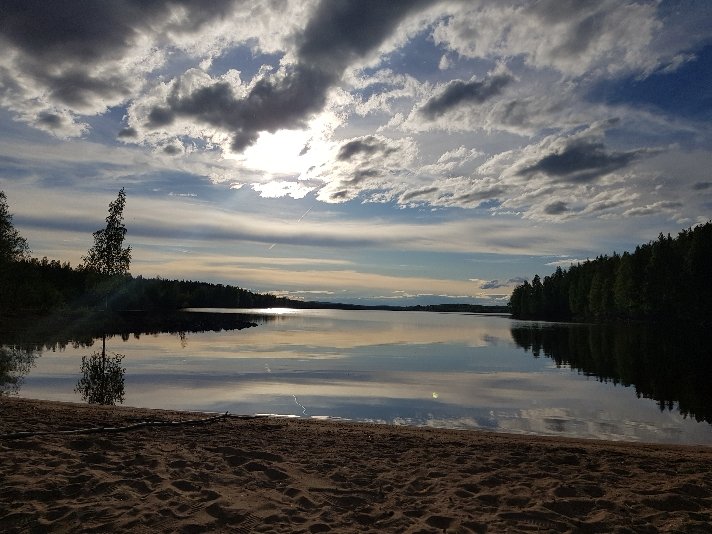 Wie immer zum Abschluss das Bild mit dem Blick auf den See mit privatem Sandstrand. Ich war sogar baden, na ja zumindest bin ich einmal kurz komplett drin gewesen, ganz schön kalt ist das Wasser.
