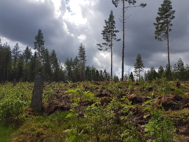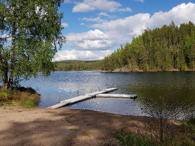 Kurz vor dieser Kreuzung kam ich an einem Haus mit freilaufendem Hund vorbei. Eine Schäferhund Promenademisching, deutlich größer als ein Schäferhund. Morz Gebell aber sein Herrchen rief ihn von der Tür aus in Unterhemd und kurzer Hose zur Ordnung. 300 Meter weiter war eine Bank, da machte ich eine kurze Trinkpause. Scheinbar wohl recht üblich, denn jetzt kamen Hund mit ausgehfeinem Herrchen vorbei und quetschten mich regelrecht aus. Er war schon am Bodensee in Urlaub. Dann erzählte er mir noch das er bei einer Gruppe mitarbeitet, die versucht gegen die großflächigen Rodungen etwas zu unternehmen. Ist scheinbar ein heißes Thema in Schweden. Rein theoretisch wäre es staatlich reguliert, aber es klappt wohl nicht alles wie es soll. Mit Holz lässt sich im Moment halt viel Geld verdienen und er war erbost und resigniert das sich so schwer etwas erreichen lässt.