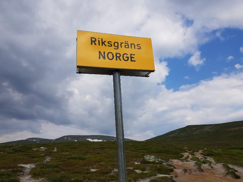 Zwei Tage Pause und das Gehen fühlt sich erst mal komisch an, ganz ungelenk fühle ich mich, der volle Bauch tut sein Übriges dazu. Nach 3km bin ich wieder im Rhythmus. Nach 4,5km erreiche ich die Reichsgrenze (die heißt hier so) zu Norwegen.