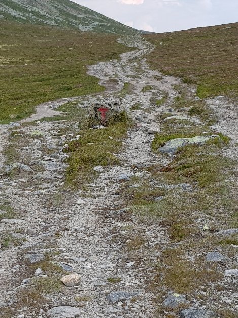 Ich habe nochmal in der Fjällstation gefrühstückt. Da brauche ich den ganzen Tag fast nichts mehr zu essen, weil das Buffet sehr gut bestückt ist und ich mir auch 1h Zeit lasse. Um kurz nach 8 Uhr gehts los. Gestern habe ich eine Waage am Eingang entdeckt. Das will ich jetzt mal wissen wie schwer der Rucksack mit reichlich Proviant für 8 Tage ist. Ich trage immer 2-3 Sicherheitstage mit mir rum. Mit 1l Trinken sind es 17kg, heftig. Inzwischen macht mir das Gewicht des Rucksacks eigentlich nichts mehr aus, aber es bestärkt mich doch nochmal auszumisten und wenn ich in spätestens 3 Wochen meinen Bruder mit Frau treffe habe ich mich hoffentlich entschieden. Ich muss später 2x für 15 Tage Essen tragen und 20kg sind definitiv meine oberste Grenze.