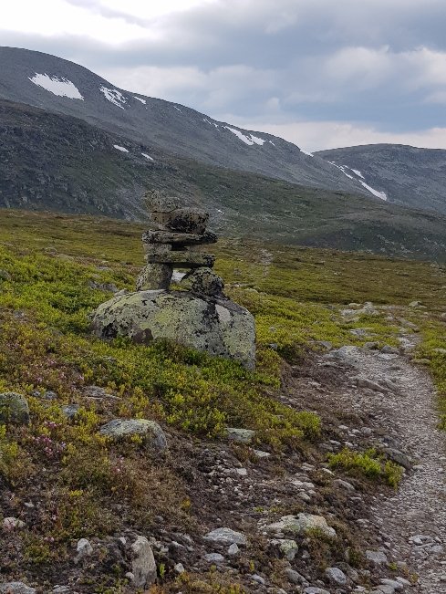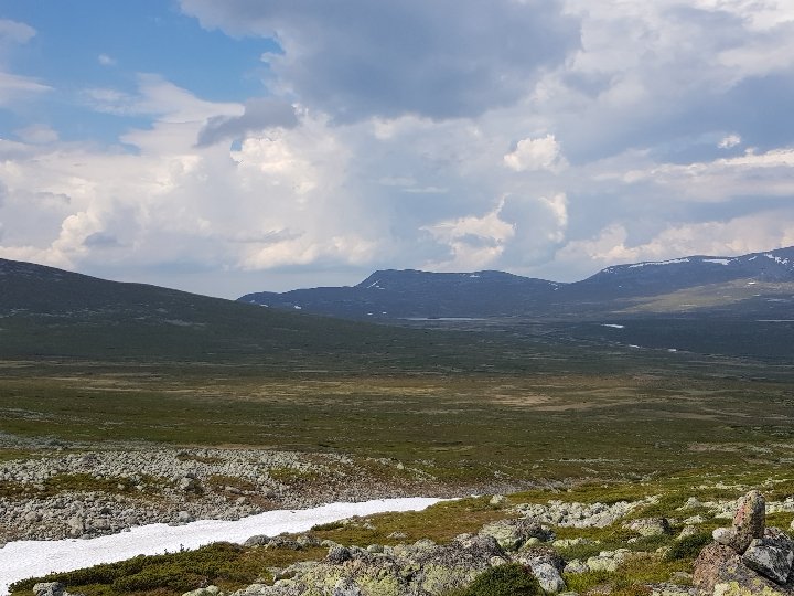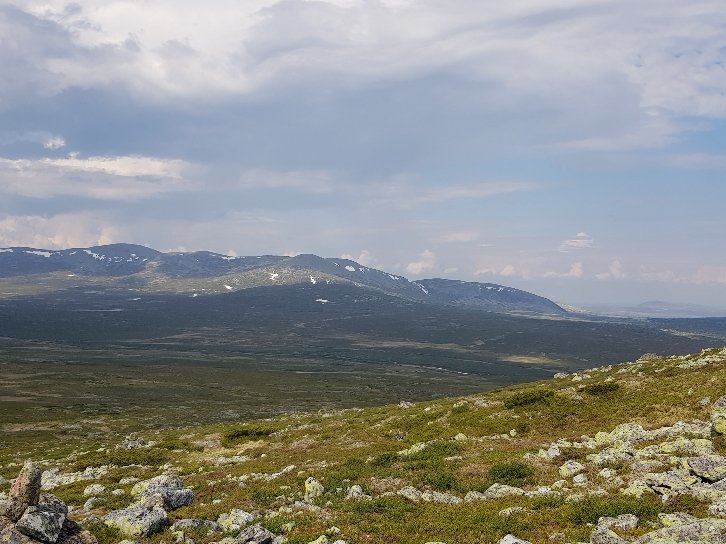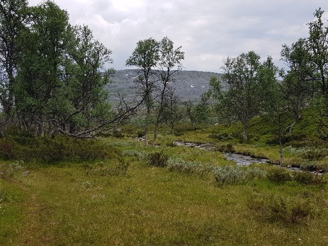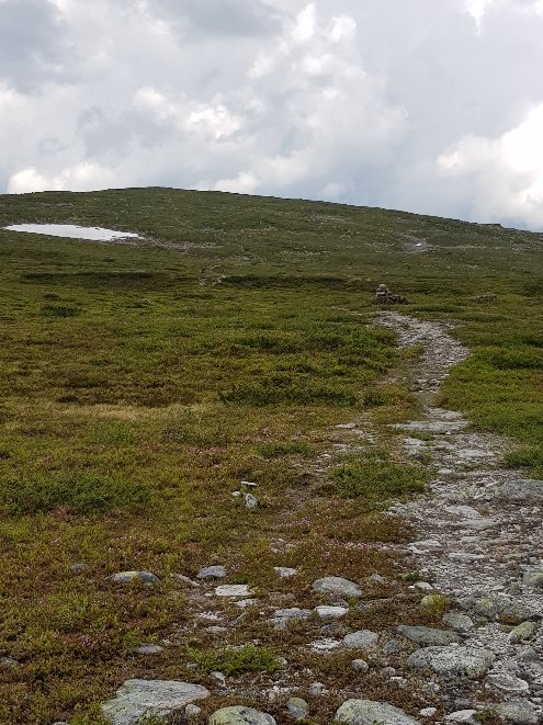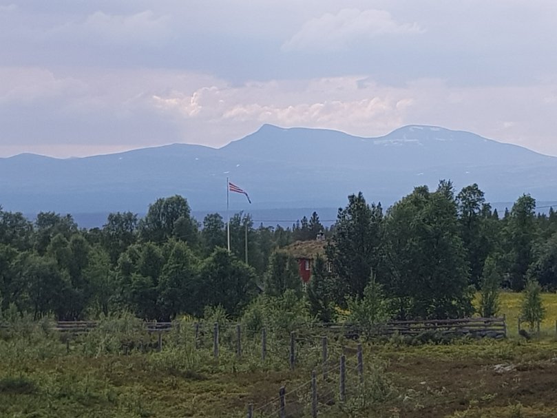 Von weitem grüßt die Fahne und zeigt eine bewirtschaftete Hütte des DNT, des norwegischen Wanderverbands an. Auf meine Frage hin was ein Bett kosten würde, wurde mir erklärt das gibt es nur komplett mit Halbpension. Trotz meiner Mitgliedschaft hätte der Spaß über 100€ gekostet. Stolzer Preis! Da war mir die Wiese daneben schon lieber. Das hat 9€ gemacht und man darf dafür Dusche und einen Aufenthaltsraum mitbenutzen. Da kann man dann gar nichts sagen. Der Raum ist nämlich super, sonst müsste ich den Block im Zelt schreiben, denn die Mückenplage ist unerträglich. Zweimal hat es noch ein wenig geregnet abet der Rest des Tages blieb trocken. Morgen geht es nur 17km weit bis zur nächsten Hütte, die dann unbewirtschaftet ist. Bin gespannt wieviel das da kosten wird.