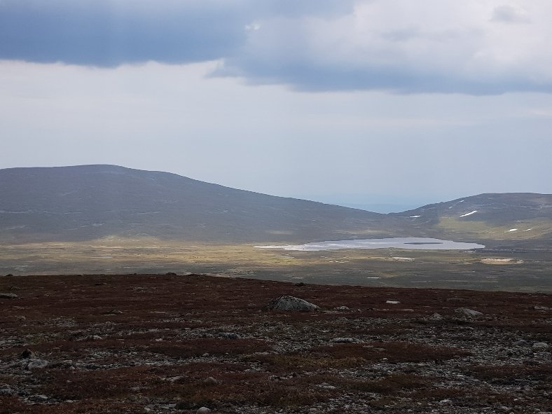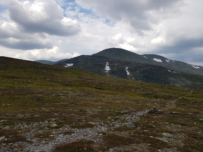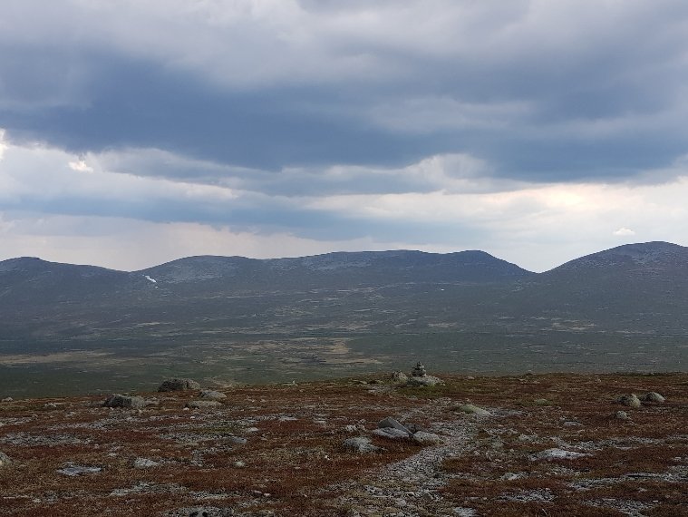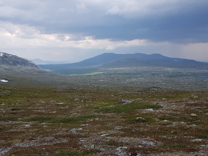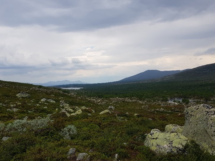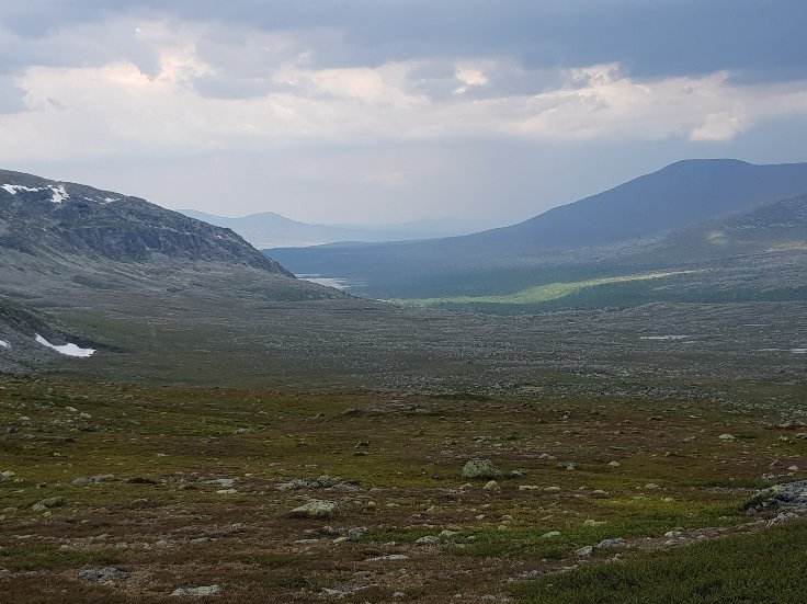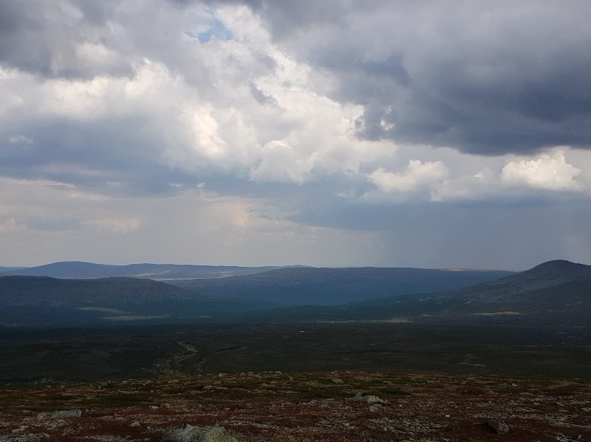 Inzwischen hat mich Johanna eine Angestellte der Fjällstation eingeholt. Sie hat 2 Tage frei und hat das gleiche Ziel wie ich. Augenscheinlich hat sie Angst vor dem Gewitter das sich schon lautstark ankündigt und wir gehen gemeinsam weiter. Eine große Flussüberquerung ist angesagt. Ich kann sie aber mit meinen festen Schuhen bewerkstelligen. Wir laufen durch sumpfiges Gebiet, nur ist es hier fast alles ausgetrocknet und nur mässig feucht. Kein Vergleich zu den Gebieten am Kungsleden und ich bin froh nicht früher hier gewesen zu sein. Ja, und dann hat es uns erreicht. Der Regen peitscht fast waagrecht von hinten seitlich wir können uns kaum auf den Füßen halten. Wir suchen leicht hektisch nach ein wenig Windschatten haben aber nicht viel Glück. Nach 20 Minuten ist es vorbei und wir gehen wiedet flotten Schrittes weiter. Obwohl ich gesagt hatte das ich bestimmt nicht so schnell bin wie sie hat sie halt ihr Tempo drauf. Sie ist max. Mitte 20. Wir müssen direkt auf einen Berg, den Forbogen 1153 Meter hoch. Nicht ganz der höchste Punkt für heute. Von oben dann diese Aussicht. Da oben beschließen wir dann das sie voraus geht.