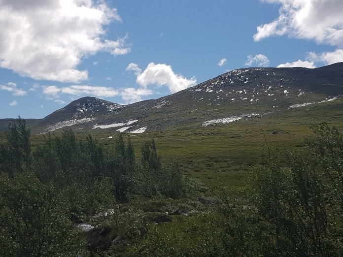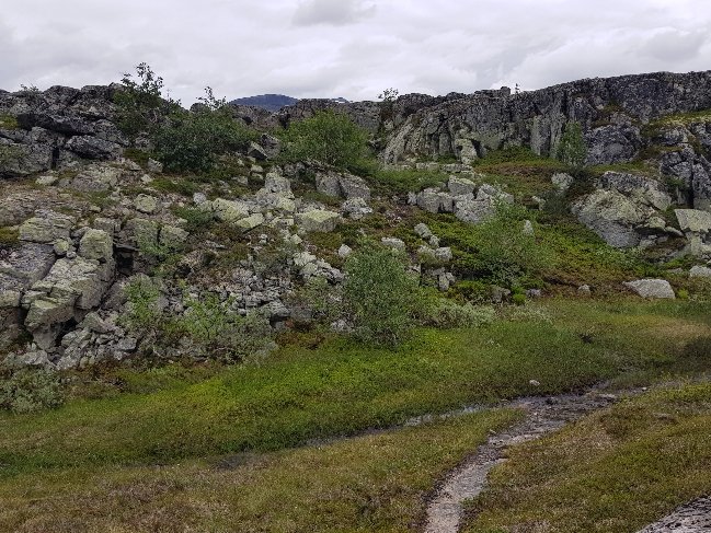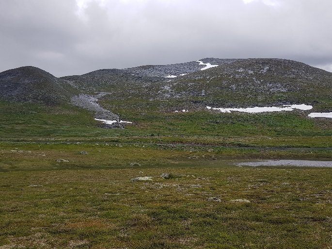 Es hat viel Zeit gekostet da die richtige Richtung und ein Durchkommen zu finden. Bei gutem Wetter mag das noch Spaß machen aber die Schlechtwetterfront war irgendwann sehr nah. Ich war froh das der Platzregen erst einsetzte als ich das Tal erreicht hatte . Nur um festzustellen das der Fluss den ich schon die ganze Zeit rauschen gehört hatte, zu durchqueren war. Ich fand keine gute Furt, entweder zu tief, etwa bis zu den Oberschenkeln oder zu reißend. Es gab einen Ausweg, eine Schotterstrasse hoch, oben über die Brücke und auf de anderen Seite wieder runter alles in allem 3km Umweg. Das alles im Platzregen auf 900 Meter Höhe also auch bei heftigem Wind. Eiskalt und klitschnass lässt es sich … wandern. Ursprünglich wollte ich ja ein Stück weiter gehen als nur bis zur Hütte und zelten, da habe ich mich umentschieden. Inzwischen hatte es zwar wieder aufgehört zu regnen aber es sollte unbeständig bleiben. Die Nedalshytte ist eine bewirtschaftete Hütte also deutlich teurer, aber mit mehr Komfort als die unbewirtschafteten Hütten. Ich war froh nur ein Zimmer mieten zu können. Für Deutsche sind die Preise für Essen schon teuer. Frühstück und Abendessen hätten ca 50€ gekostet. Aber man darf draußen kochen und innen essen was ich dann auch so gemacht habe. An Essen mangelt es mir nicht. Das Einzige was ich mir gegönnt habe waren Waffeln mit Braunkäse und Kaffee. Für Braunkäse wird die Molke eingekocht bis sie karamellisiert, eine norwegische Spezialität. Eine Leibspeise von mir wird das allerdings nicht werden.