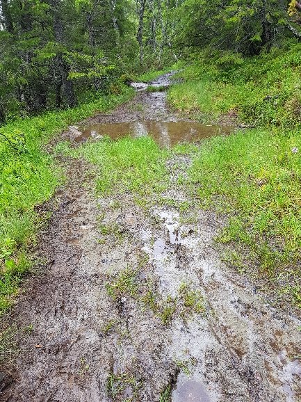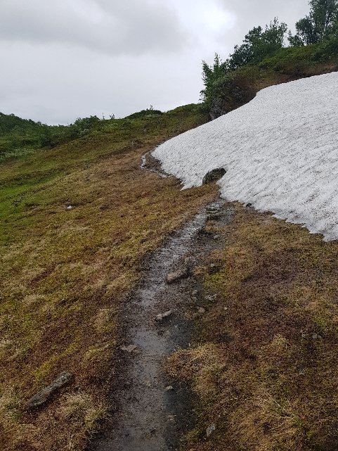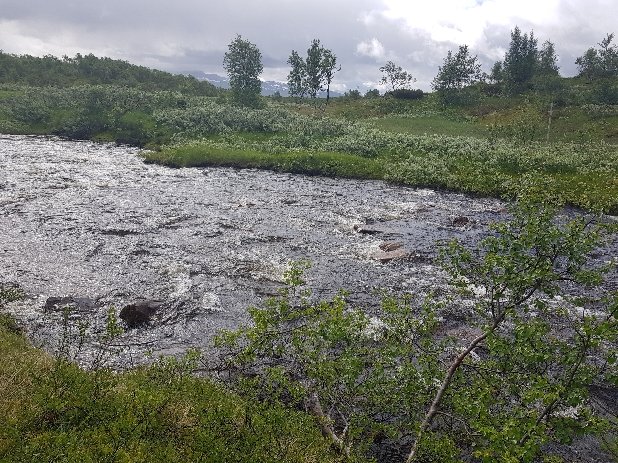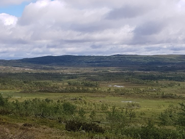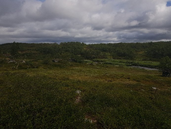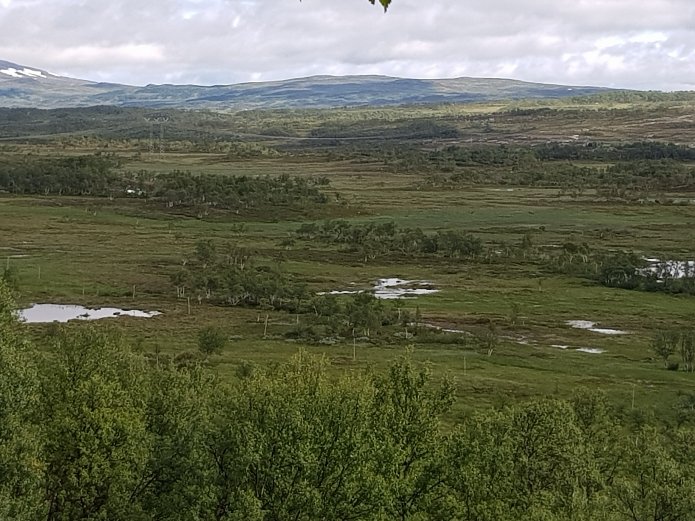 Nachdem ich fürstlich gefrühstückt habe war es fast 8.30 Uhr bis ich los gekommen bin. Zunächst noch bei trockenem Wetter. Aber die letzten regnerischen Tage hinterlassen überall ihre Spuren. Wenn das Gebiet eigentlich von Haus aus sumpfig ist dann läuft man jetzt halt permanent durch Wasser das auch noch meist in Bewegung ist. Schon nach kürzester Zeit habe ich es aufgegeben meine Schuhe zu schonen. Es fanden sich kaum trockene Stellen und ob die Füße nach 1h oder 3h nass sind ist dann auch egal. Ich habe mich ja gestern Abend noch entschieden meine Route so abzuändern, dass ich heute nicht im Zelt sondern in einer Hütte schlafen kann. Es war ja wieder für den ganzen Tag Regen und teilweise starker Wind vorhergesagt. So war es dann noch mal ein längerer Tag bevor ich dann morgen mit hoffentlich entspanntern 15km in Teveltunet ankomme.