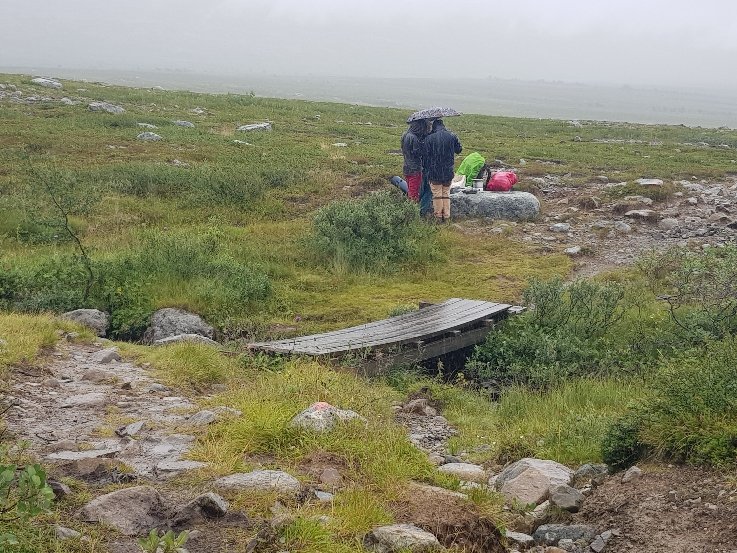 Danach gings dann endlich mit wandern los. Nach 500 Metern wurde ich von einem deutschen Mädchen aufgehalten, die mir erzählte das in der Region Kebnekaise das ist ca 50km von hier entfernt, alle Hütten gesperrt sind weil wahrscheinlich der Noro – Virus ausgebrochen ist. Die Hütten nehmen nur noch Personen mit Vorreservierten Zimmern an. Da habe ich nochmal Glück gehabt, denn das gilt auch für meine heutige Übernachtung. Ich habe es hier live erlebt, alle die aus dem Norden kamen durften nicht rein. Draußen zelten ja, aber mehr nicht.