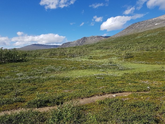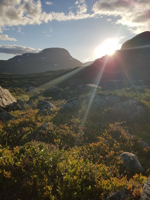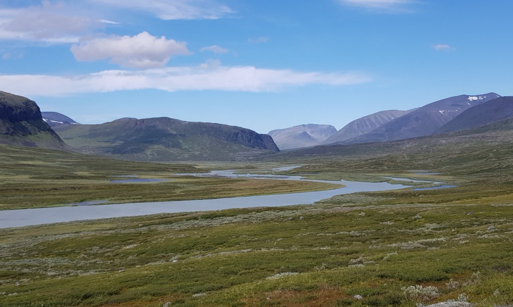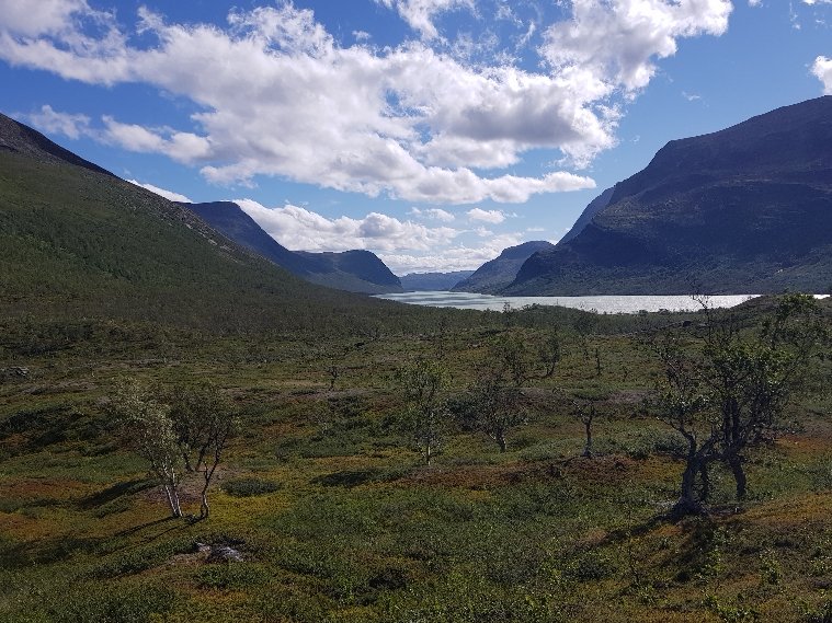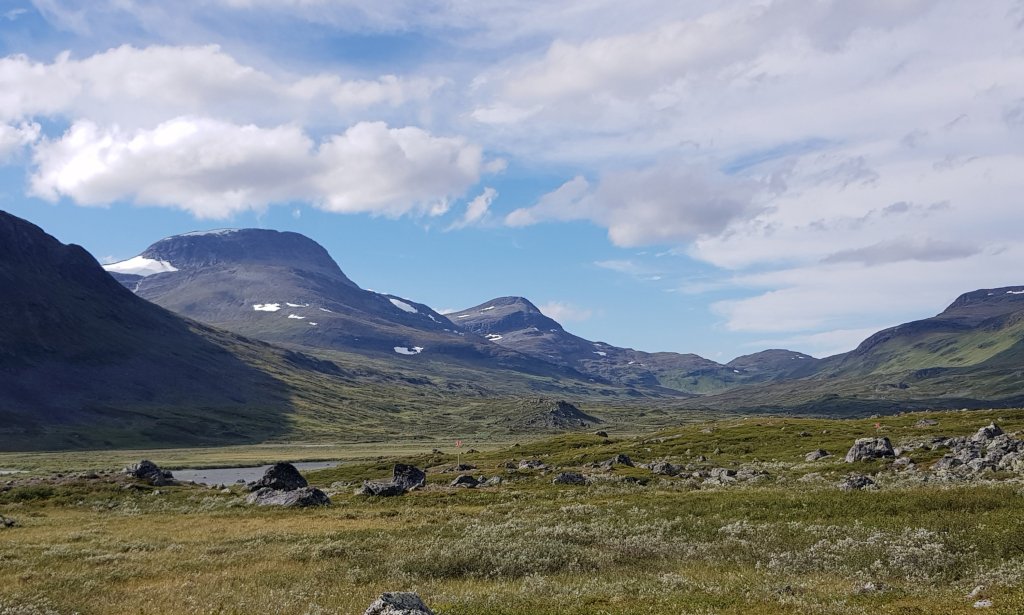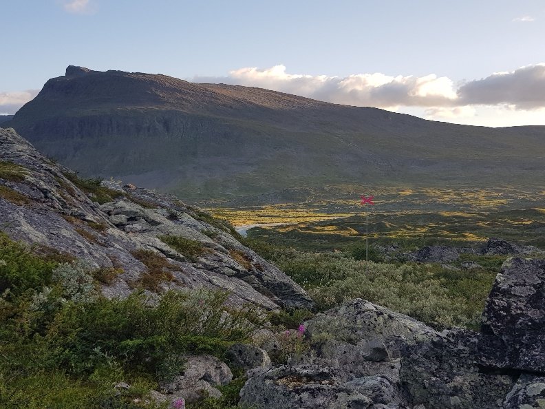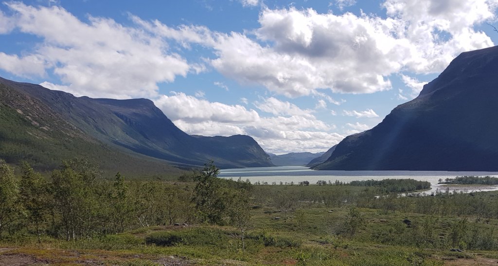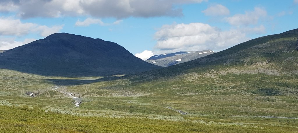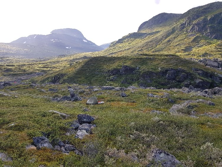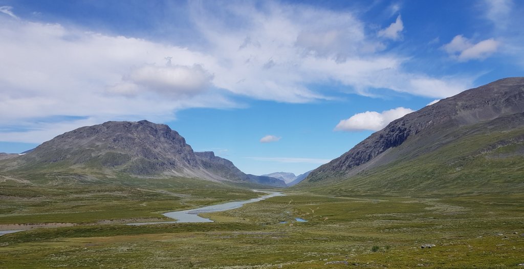 Die Nacht war etwas unruhig. Der böige Wind ließ das Zelt oft bedenklich wanken und die Plane flatterte lautstark. Aber alle Heringe haben ihren Dienst verrichtet und so stand das Zelt in der Früh immer noch 1a da. Durch den Wind hatte sich sogar gar kein Kondenswasser gebildet und ich konnte alles trocken verpacken, das passiert selten. Auch heute blies der Wind kräftig bis stürmisch, aber bei angenehmen Temperaturen. Manchmal war es ein Kampf vorwärts zu kommen. Dafür war heute der Tag der unvergesslichen Landschaft. Das ich das wirklich selber sehen würde, daran habe ich nicht mehr geglaubt. Die Ausblicke die sich mir geboten haben, kenne ich nur aus Büchern oder dem Netz. An dem Fluss Tjäktjajåkka werde ich morgen auch noch entlang wandern. Teilweise reißende Strömung, dann wieder sich ausbreitend wie ein Delta, tiefe Schluchten unglaublich vielfältig und oft sehr lautstark und links und rechts die Berge, ein Erlebnis.