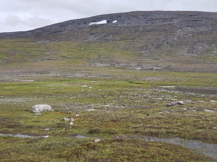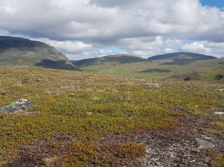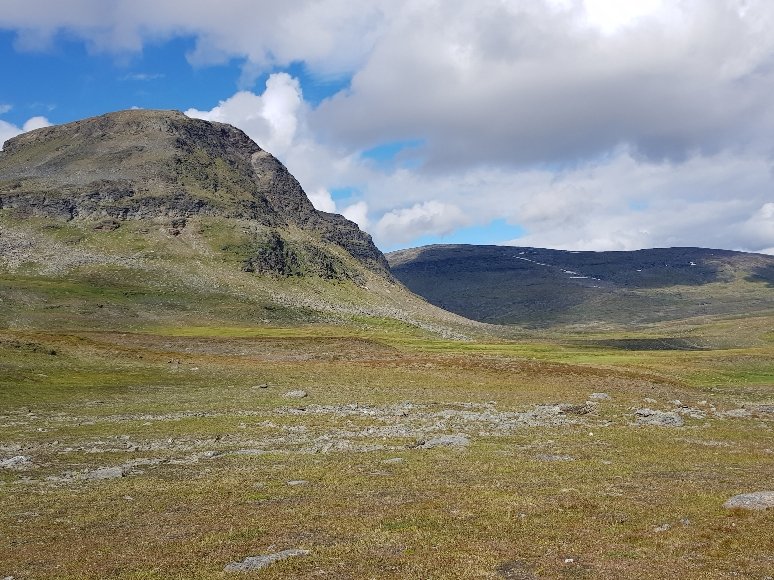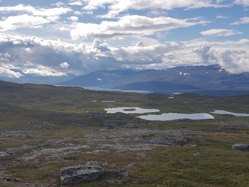 Insgesamt habe ich 3 Menschen getroffen, davon einen, den ich vor einer Woche kurz vor Saltoulokta das letzte Mal gesehen habe und der das Grüne Band läuft. Da war ich doch überrascht, das Morten nicht weiter voraus ist. Nach 14km fast nur aufwärts begann der lange Abstieg den ich morgen beende. Spätestens ab morgen Mittag soll es stark regnen und ich werde dann eine Hütte ansteuern und hoffentlich alles trocknen können.