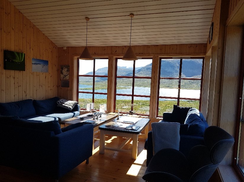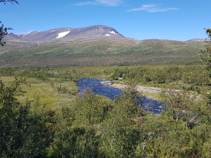 Hier mache ich Mittagsrast und kurz nach mir trifft Todl aus der Nähe von Holzkirchen ein. Er ist am Nordkap gestartet und trifft in Abisko seine Frau. Schon witzig, mitten im hohen Norden treffen sich zwei Bayern die daheim gar nicht so weit entfernt voneinander wohnen. Wir verbringen eine gemütliche Stunde in der wunderschönen Hütte bei einer Tasse Kaffee und jeder plündert seine Vorräte. Ich erhalte Bestätigung über meine Recherche der Rückreisemöglichkeiten vom Nordkap aus. Nachdem es erst 14 Uhr ist, beschließen wir, jeder noch ein Stück zu gehen. Für mich geht es ein langes Tal hinab. Verschlungene Pfade durch Birkenurwald wechseln sich mit freieren Flächen ab. Ein wenig lang wird die Etappe für mich, weil lange Zeit kein Wasser kommt an dem ich mein Zelt aufstellen kann. So lande ich an der Hängebrücke mittig mittig auf dem Weg zur nächsten Hütte. Um über die Hängebrücke zu gehen, muss morgen früh auf diesen Felsen raufklettern, das wird kein Spaß.