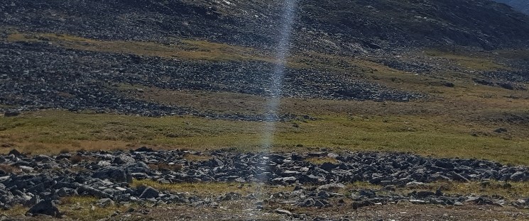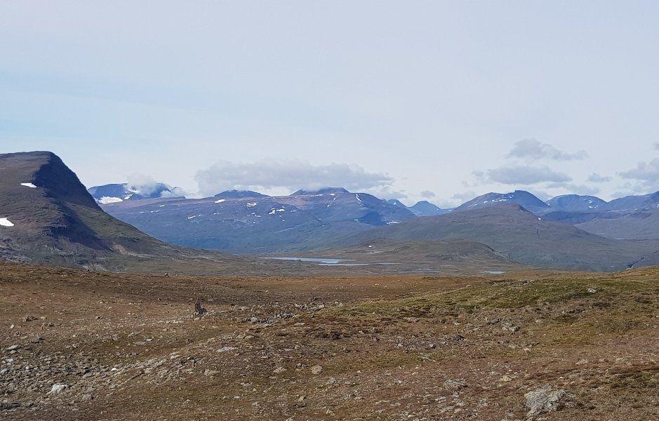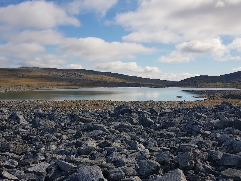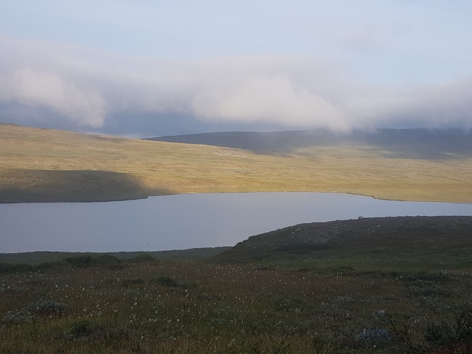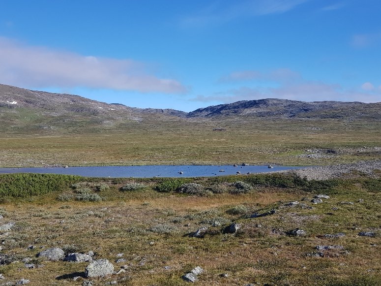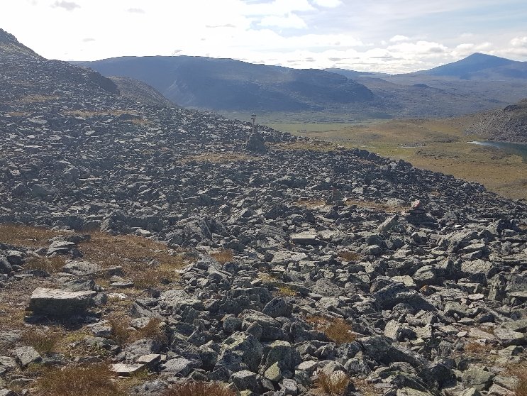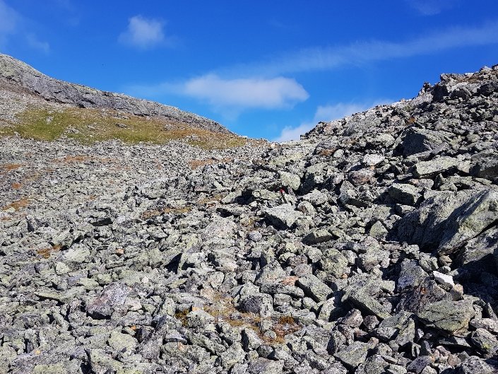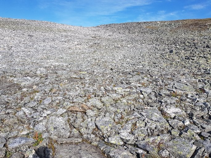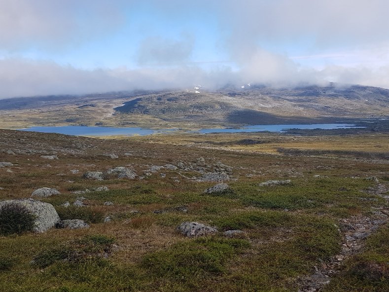 Hier treffe ich ein junges norwegisches Pärchen aus der Gegend, die eine Wochenendwanderung machen. Das Wetter soll auch morgen noch schön sein erfahre ich. Interessant ist immer, dass die Norweger von unseren Alpen wissen und Bilder kennen. Danach gehts wieder hoch hinaus auf über 1000 Meter. Insgesamt wandere ich heute 15km über Stein- und Blockfelder. Es hat seinen eigenen Reiz und ich verfalle fast in eine meditative Stimmung. Jeder Schritt braucht viel Konzentration, da bleibt kein Platz für andere Gedanken.Wenn ich stehen bleibe ist absolut kein Geräusch zu hören, ganz unwirklich.