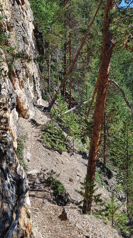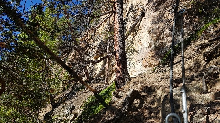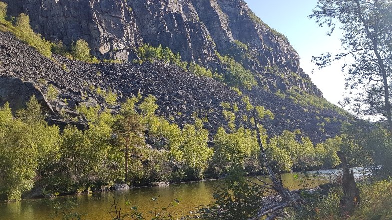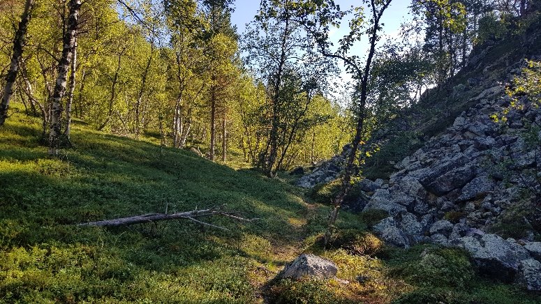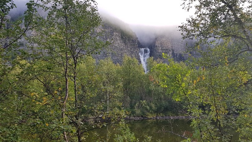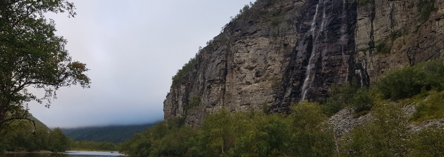 Nach insgesamt 30km (heute nur 17 km, der Rest gestern) den Weg bahnend auf schmalsten Pfaden, oft hoch über dem Fluss, dann haarscharf am Ufer entlang, balancierend über Felsen erreiche ich die Nedrefoshytta. Dort sehe die einzigen 2 Menschen und ihren Hund am heutigen Tag. Ich mache Mittag und dann gehts über die Hängebrücke und nachdem gegenüber nur eine Felswand ist, kostet es mich einige Überwindung auf dem rutschigen zerbröselnden Felsenschotter, entlang zu gehen. In diesem Fall, habe ich immer laut vor mich hin gesagt: „Ich hasse es…“. Irgendwie hat mir das geholfen, nicht an die Angst vorm Fallen zu denken, solche Stellen sind einfach nichts für mich. Eine Alternative gibts nicht, also muss ich da durch. Später gab es nochmal so eine längere Stelle, aber die hatte eine Seilsicherung und nach unten waren Bäume da ist für mich schon deutlich leichter zu bewältigen.