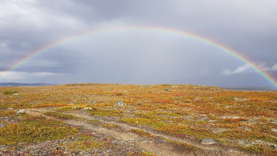 Das nächste Unwetter tobt sich über dem See Iesvari aus, ich bekomme nur ein bisschen Regen ab, dafür diesen riesigen Regenbogen.