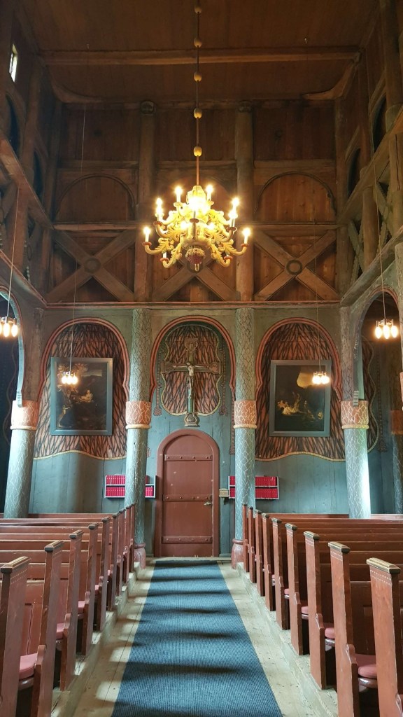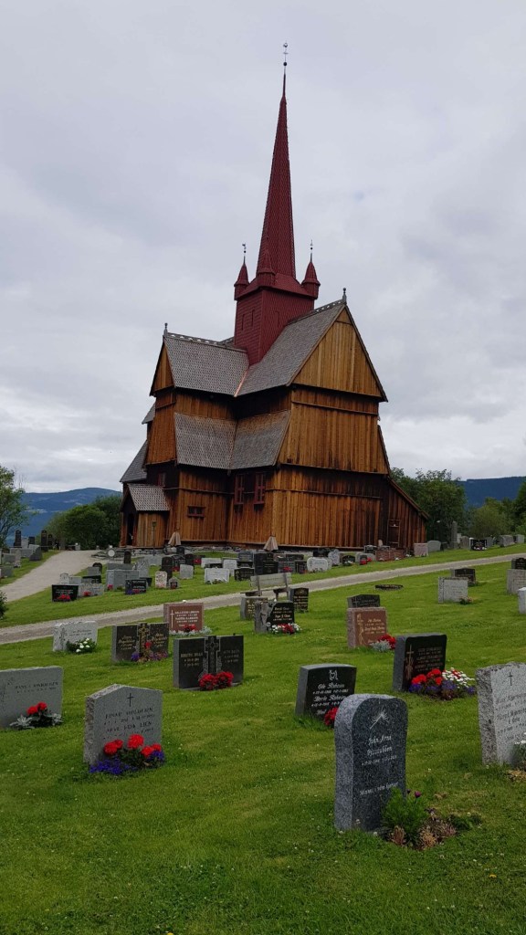 Als erstes komme ich zu einer der ältesten der noch 28 existierenden Stabkirchen Norwegens in der Nähe von Ringebu. Ein Teil der Kirche stammt noch aus dem 13. Jahrhundert. Im Laufe der Jahrhunderte wurde der ein oder andere Teil ergänzt. Ich war so früh da, das ich noch 45 Minuten Warzezeit überbrücken musste. Aber so konnte ich in aller Ruhe das Atmosphäre rundherum genießen, denn pünktlich zur Öffnung stand auch schon der erste Reisebus mit Deutschen vor der Tür. Sie hatten scheinbar einen straffen Zeitplan, denn nach einer Viertelstunde waren sie auch schon wieder weg. Schön für mich, denn jetzt hatte ich die Kirche eine Zeitlang für mich allein. Für Pilger ist der Eintritt auch noch kostenfrei, auch schön.