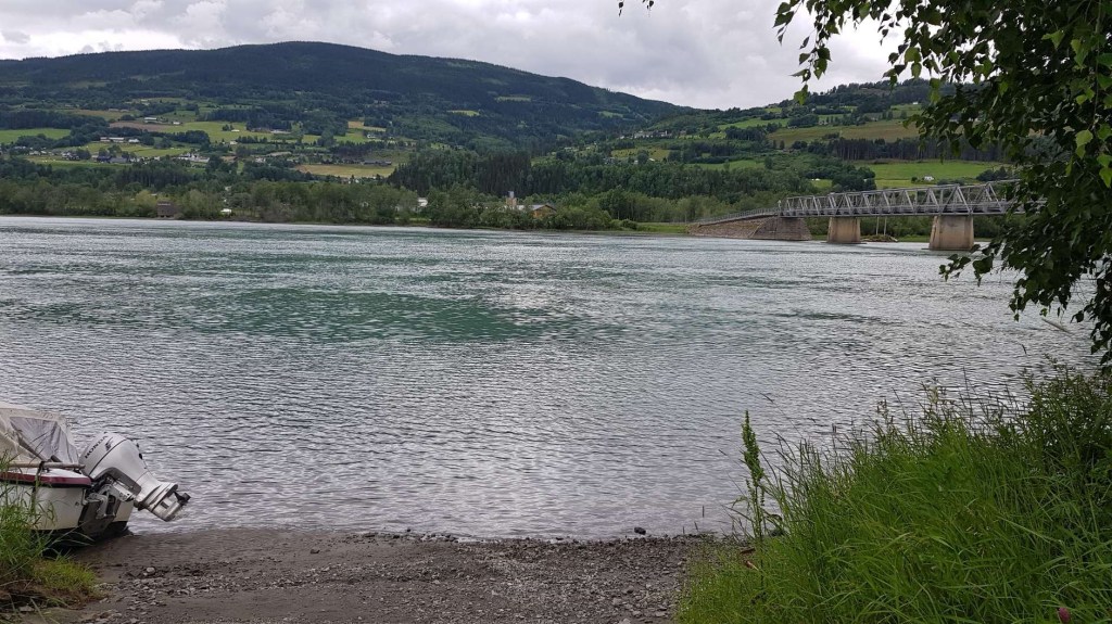 Am Schluss habe ich noch einen Tipp für einen schönen Platz zum zelten erhalten und so bin ich am Ufer des Lagen gelandet. Das ist der Fluss der durch das Gudbrandsdal fließt. Inzwischen bläst ein kräftiger Wind, der hat dann auch die Mücken vertrieben und ich kann gemütlich am Ufer sitzen.