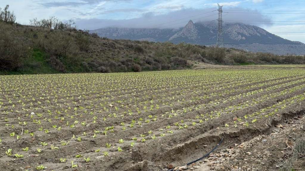 Anfangs an riesigen Feldern vorbei, ein Teil schon mit Salatpflanzen besetzt und der Rest vorbereitet. Überall ist die Bewässerung schon verlegt.
