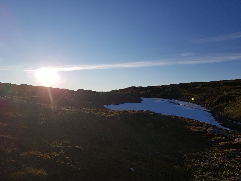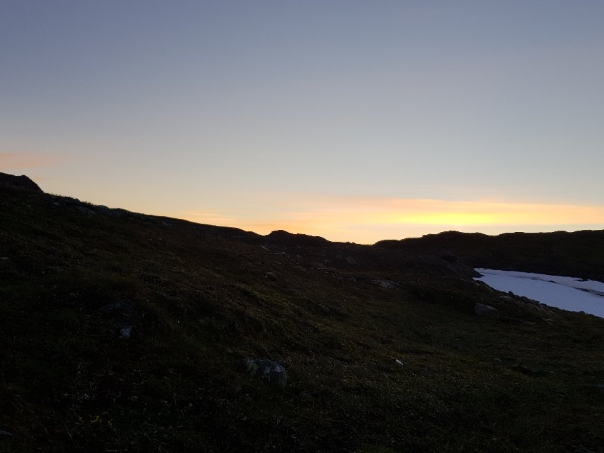 Der hohe Berg an dessen Fuß ich mein Zelt aufgeschlagen habe heißt Rotfjället. Ein bisschen veräppelt komme ich mir vor als abends um 22 Uhr der Himmel plötzlich wolkenlos wird und ich einen Sonnenuntergang erlebe. Wäre schön wenn die Sonne auch tagsüber mal raus käme.