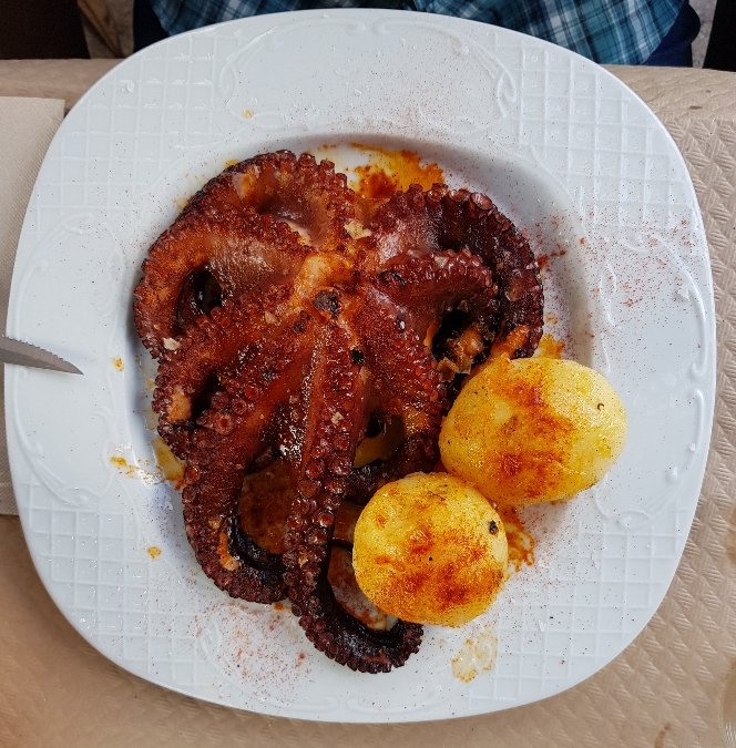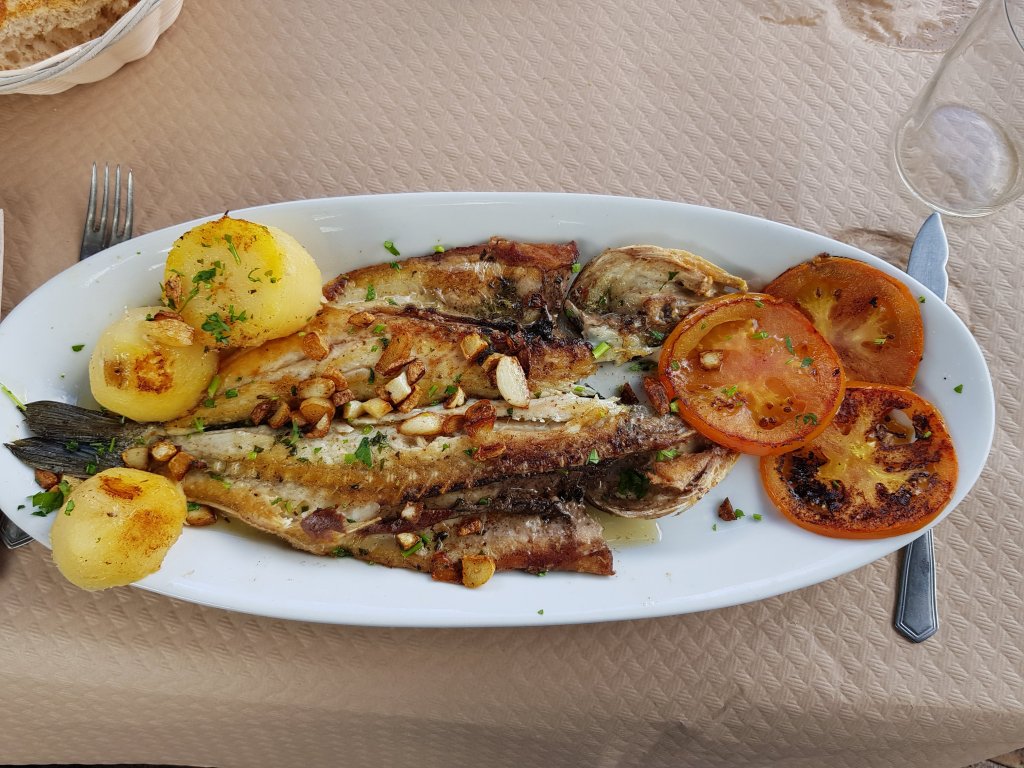 Heute Abend haben wir endlich mal richtig gut Fisch gegessen. Alfons den Tintenfisch und ich einen Wolfsbarsch.
