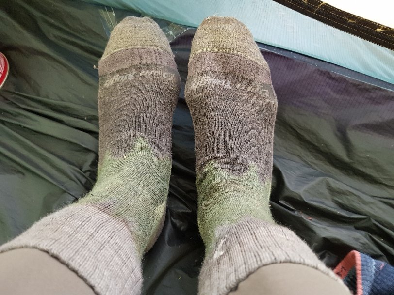 Morgens stelle ich fest, meine Socken haben ein kleines Loch. 4000km haben sie durchgehalten und das oft bei widrigszen Bedingungen. Mrhr kann man nicht verlangen, darum gibt es ein Bild dazu. Geflickt wird übrigens mit Zahnseide, die ist für jedes Nähproblem die Lösung für den Wanderer.