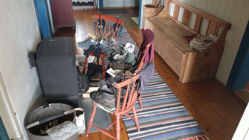 Ofen eingeheizt, dann schaffen es die Schuhe schon in 14h zu trocknen Fokstugu, links das Haus für die Pilger