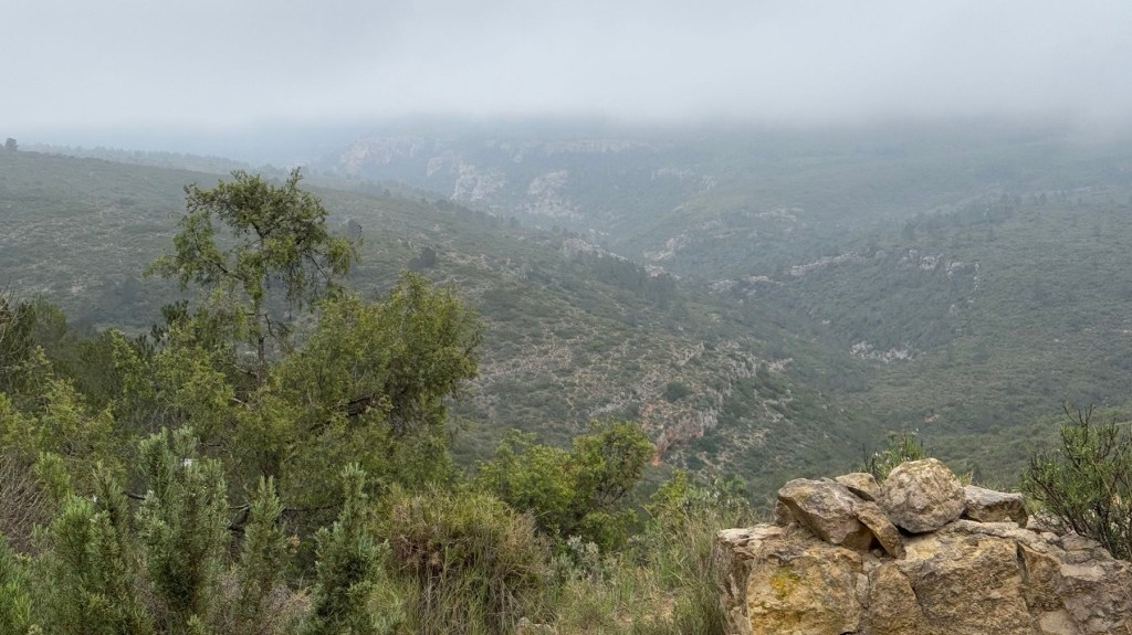 Früh um vier machte sich der ortsansässige Hahn das erste Mal bemerkbar. Aber ich war müde genug um wieder einzuschlafen. Meistens starte ich gegen halb neun, so auch heute. Zu sehen gab es nicht viel, weil je höher ich kam die Sicht sich immer weiter reduzierte. Eigentlich war ich teilweise in Schluchten von Flüssen unterwegs, ich habe halt so gut wie nichts davon gesehen. Ein offizieller Fluss laut Karte führte dann sogar mal Wasser, eine echte Überraschung.