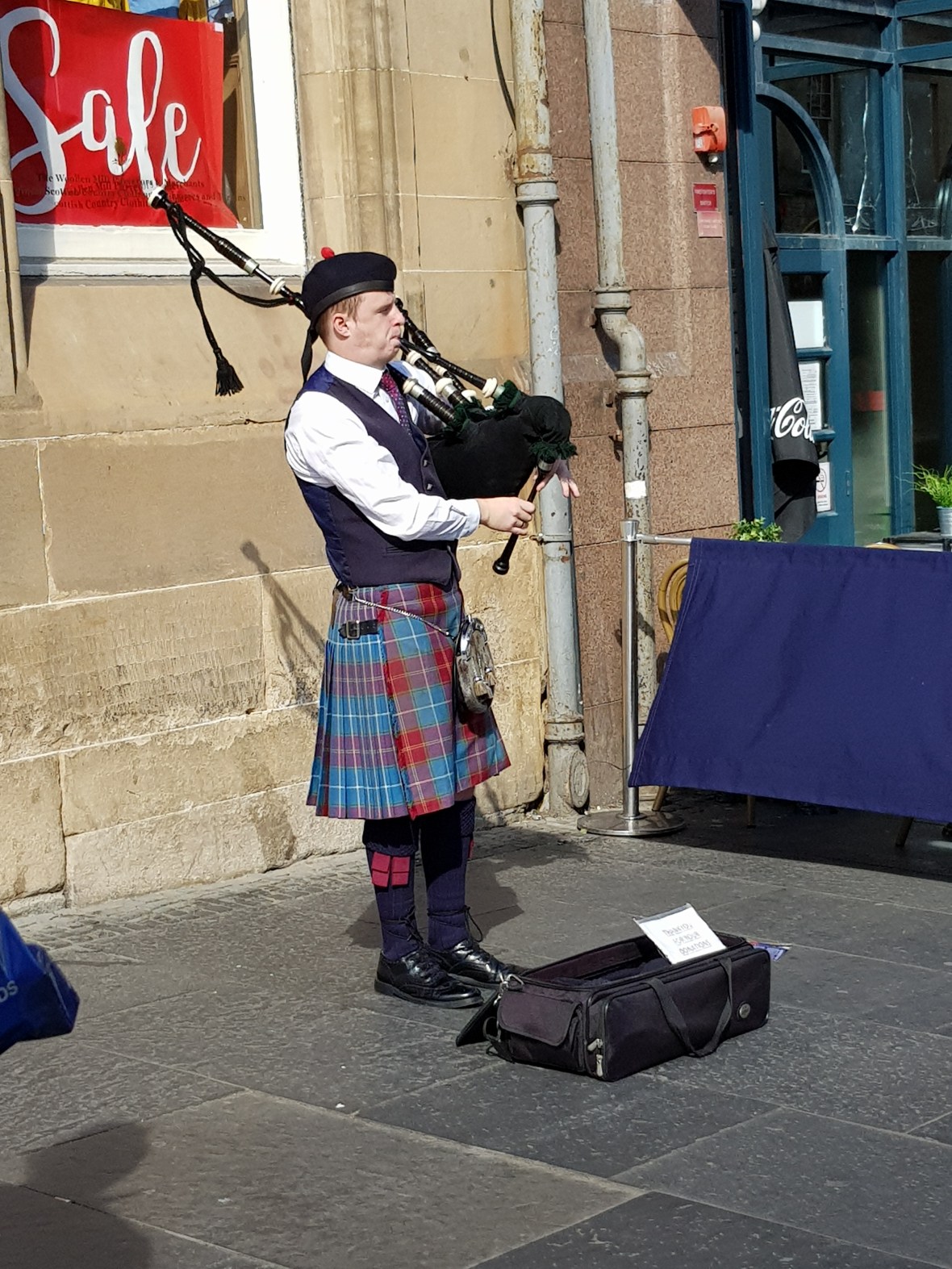 und von außen.Natürlich habe ich heute Fish and Chips gegessen, einmal wird allerdings reichen. Ziemlich fettige Angelegenheit!Von den Dudelsackspielern haben wir mehrere in der Altstadt angetroffen.