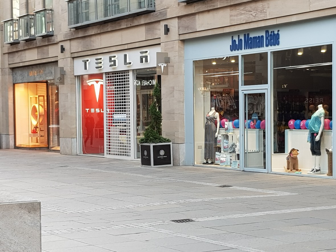 Fußgängerampeln interessieren die betreffenden wenig bis gar nicht. Es wird nach rechts und links geschaut und dann gehts los, die Farbe der Ampeleganten? Uninteressant! Die Umstellung auf den Linksverkehr ist auch gewöhnungsbedürftig.Eine Kuriosität in der Fußgängerzone.Ein Tesla Laden zwischen einem Mutter Kind Geschäft und einem super noblen Modeladen.