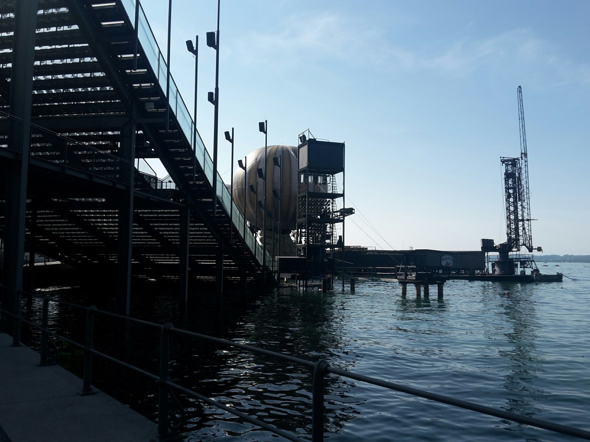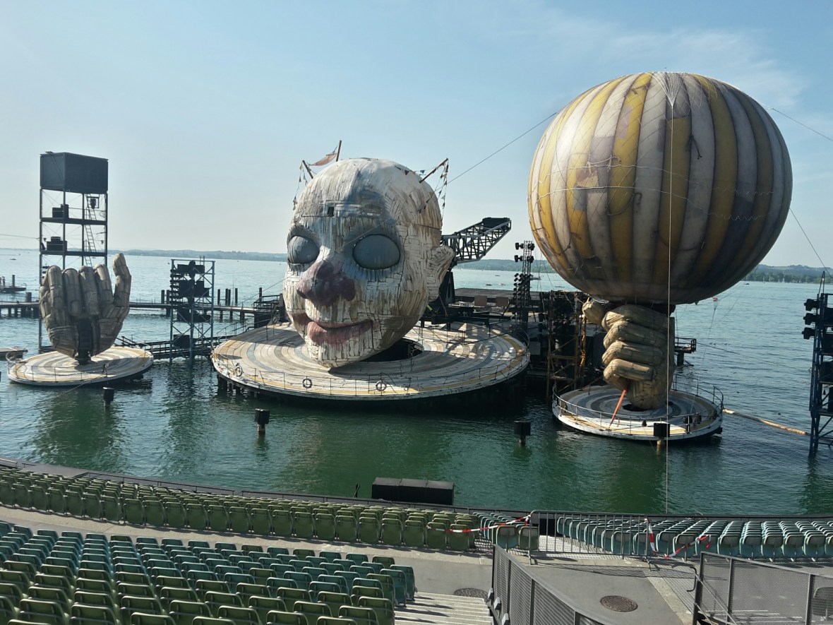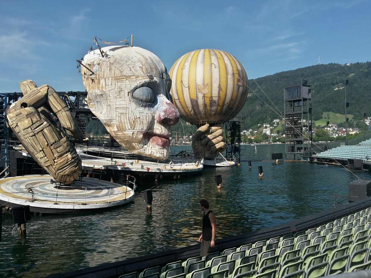 Natürlich nicht zu Fuß. Hier war die ÖBB gefragt. Leider mit ähnlichem Ergebnis wie die DB. Nur die Ausrede war neu. Wegen einer Störung eines ausländischen Unternehmens hat der Zug 30 Minuten Verspätung, aus denen dann 45 wurden. Mein Teil des Zuges wurde dann gar nicht mehr nach Innsbruck geschickt und ich bin mit einem anderen Zug eine Stunde später gefahren. Den Campingplatz Inhabern von Camping Mexico sei Dank für das längere Freihalten des Platzes, sodass ich auch um 18.30 Uhr noch ein freies Plätzchen vorgefunden habe, denn auch dieser Zug hatte am Ende 25 Minuten Verspätung.Endlich in Bregenz angekommen, begegnet einem die Seebühne fast über dem Bodensee schwebend. Mit einem tollen Bühnenbild, denn die Festspiele beginnen demnächst.