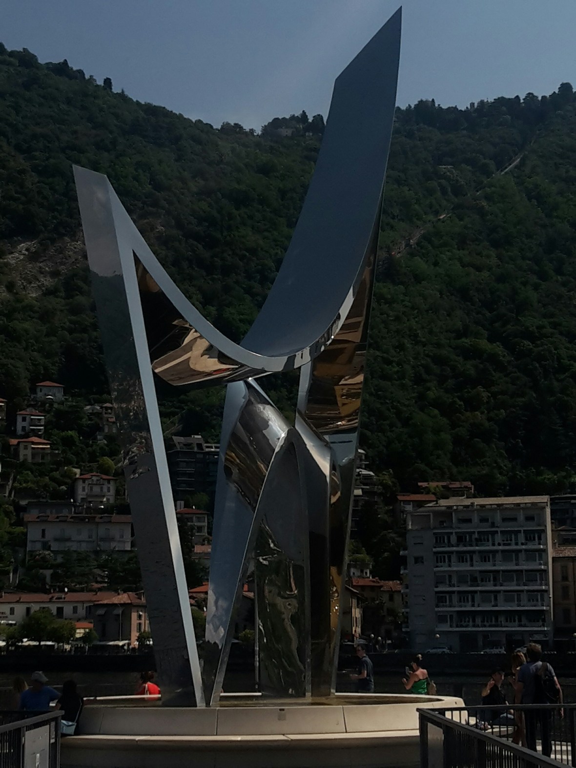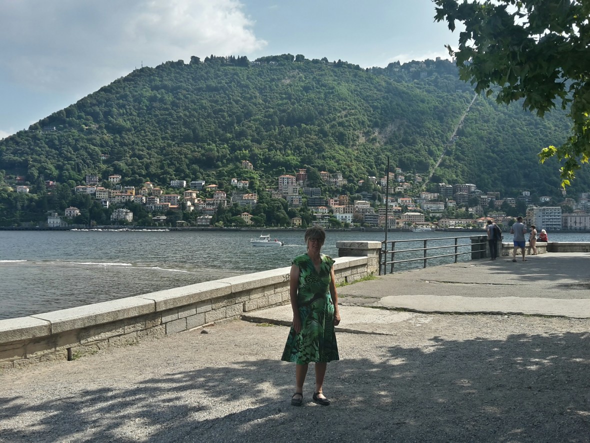 Hinab wird es abenteuerlich. Der Weg ist am Anfang eine ausgewiesene Profi Mountainbikestrecke. Ich komme fast nicht vorwärts. Irgendwann wird es leichter ich darf auf einer schmalen Straße laufen fast nichts los. Dann ist diese auf einmal wegen Bauarbeiten gesperrt. Ich bin ja immer noch am steilen Abstieg des Berges und ein anderer Weg findet sich nicht so einfach. Da es schon nach 17.30 Uhr ist , denke ich zu Fuß komme ich schon durch, es arbeitet ja keiner mehr. Es hat geklappt war aber nicht leicht. Zwischendurch habe ich mal immer wieder Blickkontakt mit dem See und denke jetzt bin ich gleich unten. Dann endet die Treppe abrupt an einer schmalen Ausfallstrasse die ich etwa 500 Meter bergab gehen soll. Am Boden ein abgetrennter Streifen für Fußgänger. In der Theorie. In der Praxis kommen die Autos so schon kaum aneinander vorbei und es interessiert sich keiner ob ich da komme. Da kann ich nicht langgehen. Auf jeder Seite hohe Stützmauern. Ich schaue verzweifelt auf meinen Plan auf dem Handy. Wenn ich einen km bergauf gehe müsste ich über die Bahngleise auf der anderen Seite , die da oben verlaufen, kommen. Also im tosenden Verkehr mit nur ganz wenig Platz für Fußgänger, bergauf. Ich bin schon fast oben, da wird die Straße wieder so eng, kein Durchkommen möglich, es ist mir zu gefährlich. Was mach ich jetzt, es bleibt nur der Weg zurück den ganzen Berg hinauf und von dort einen neuen Abstieg suchen. Da fällt mir ein , das ich eine Bushaltestelle gesehen habe. Also wieder ein Stück die Straße runter und tatsächlich, da ist sie und der Bus soll in zehn Minuten kommen. Er kommt und ich möchte nur eine Station mitfahren. Der Busfahrer lässt mich umsonst rein und so komme ich endlich den Berg runter. Ja und natürlich muss ich zuerst zum See.
