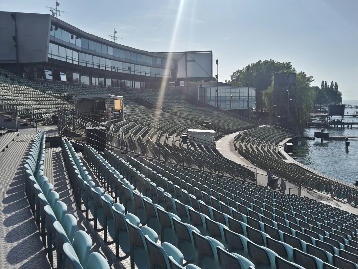 Natürlich nicht zu Fuß. Hier war die ÖBB gefragt. Leider mit ähnlichem Ergebnis wie die DB. Nur die Ausrede war neu. Wegen einer Störung eines ausländischen Unternehmens hat der Zug 30 Minuten Verspätung, aus denen dann 45 wurden. Mein Teil des Zuges wurde dann gar nicht mehr nach Innsbruck geschickt und ich bin mit einem anderen Zug eine Stunde später gefahren. Den Campingplatz Inhabern von Camping Mexico sei Dank für das längere Freihalten des Platzes, sodass ich auch um 18.30 Uhr noch ein freies Plätzchen vorgefunden habe, denn auch dieser Zug hatte am Ende 25 Minuten Verspätung.Endlich in Bregenz angekommen, begegnet einem die Seebühne fast über dem Bodensee schwebend. Mit einem tollen Bühnenbild, denn die Festspiele beginnen demnächst.