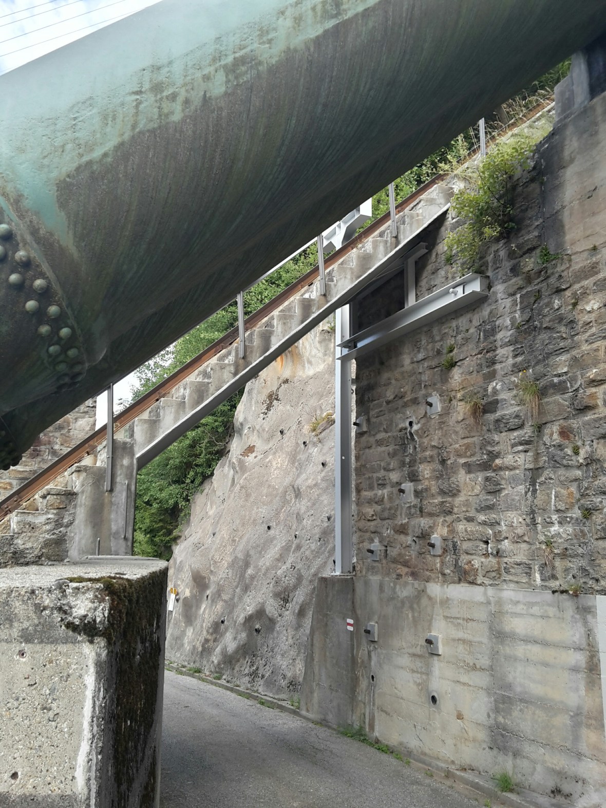 Eine Zahnradbahn und Wasserrohre führen über die Straße. Nur kleine Autos passen da drunter. Das ist praktisch eine Zustiegsstation, ist aber scheinbar nicht mehr in Betrieb.