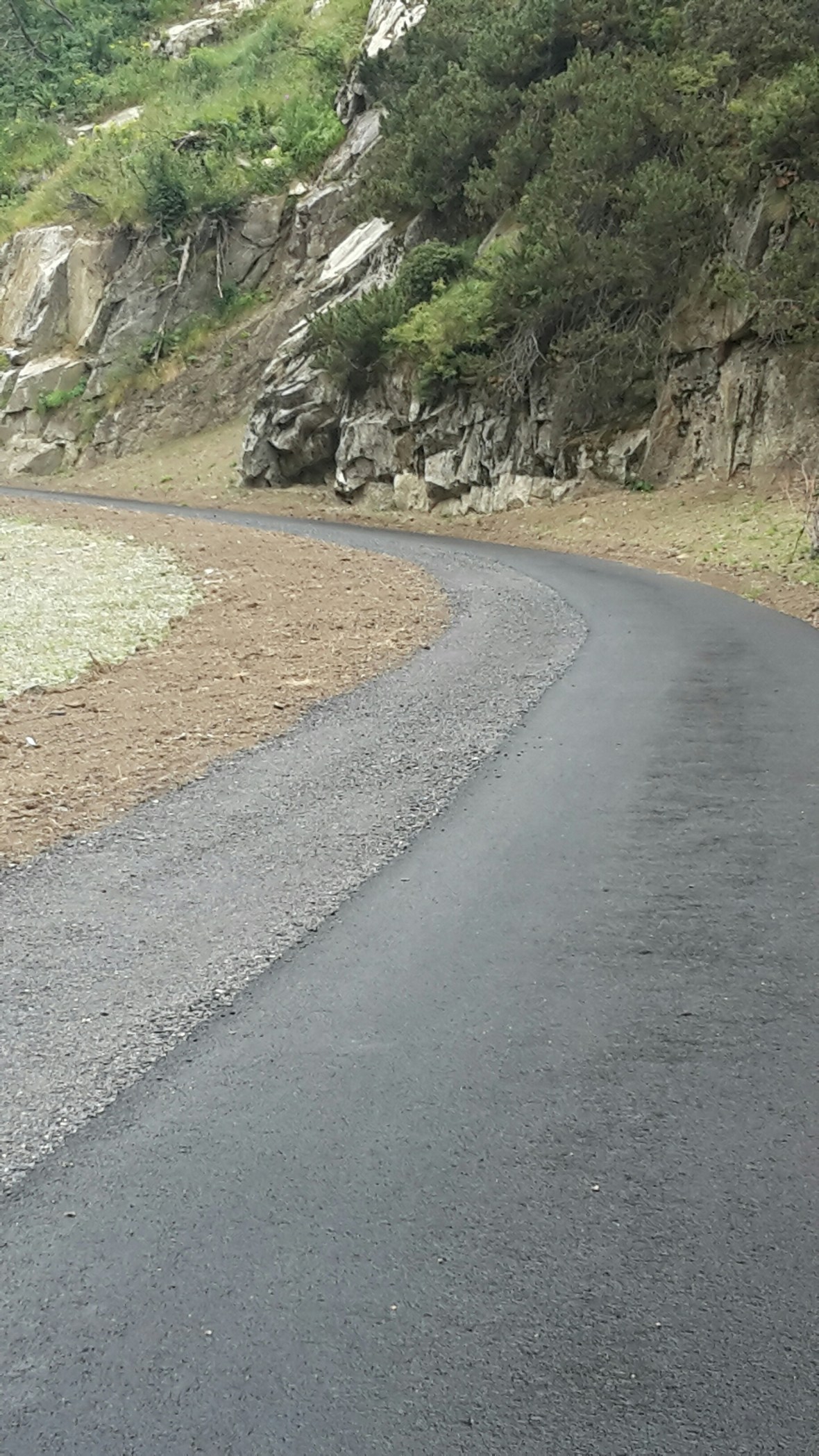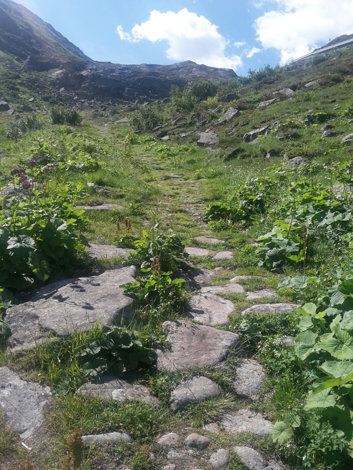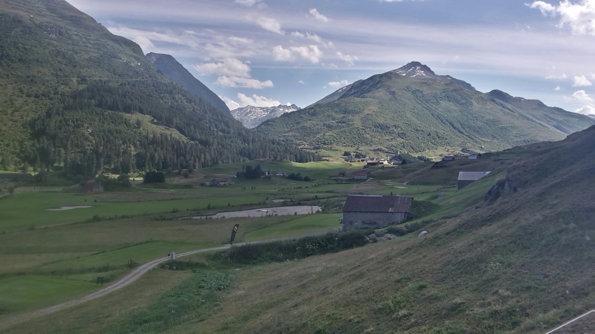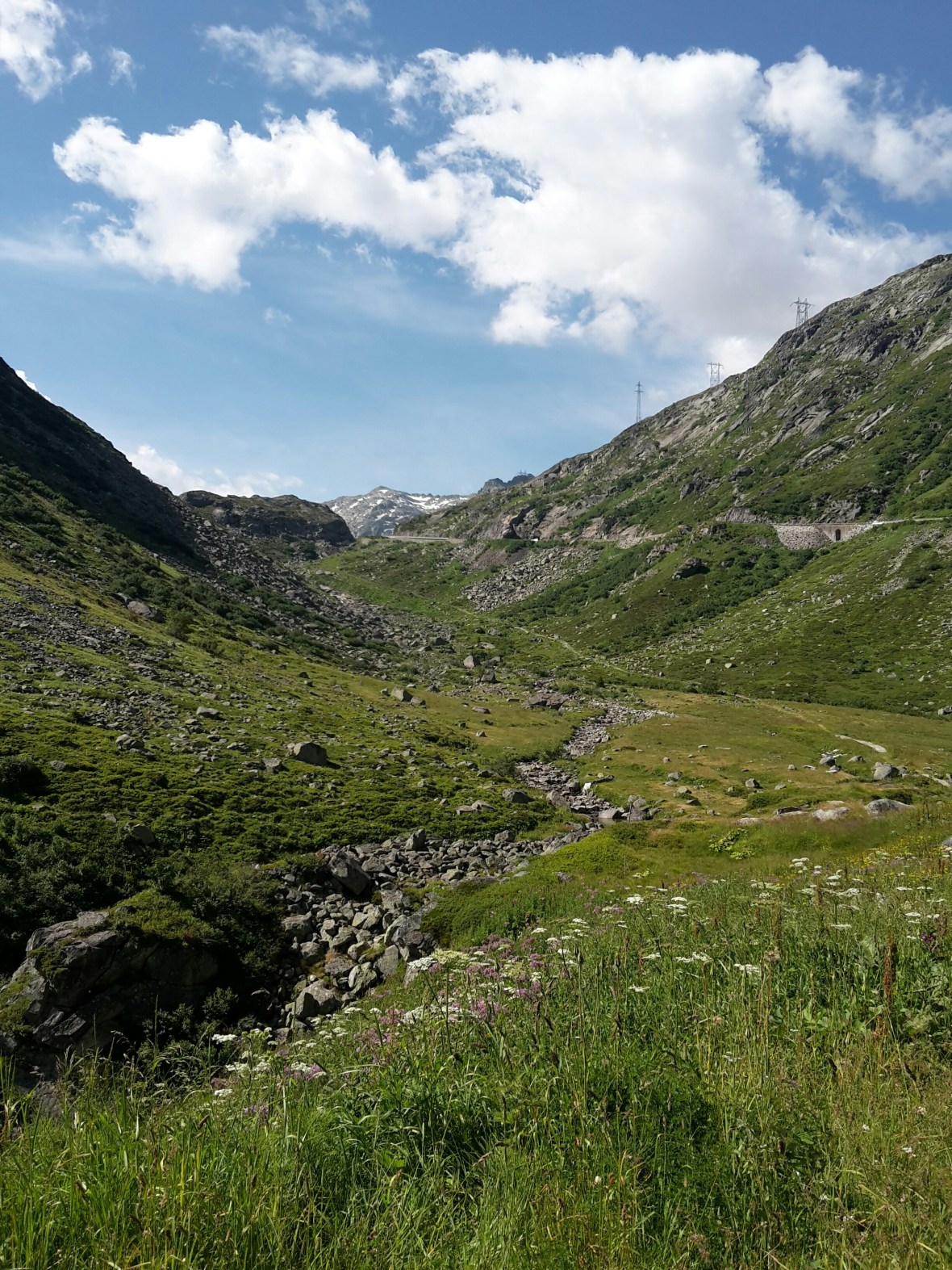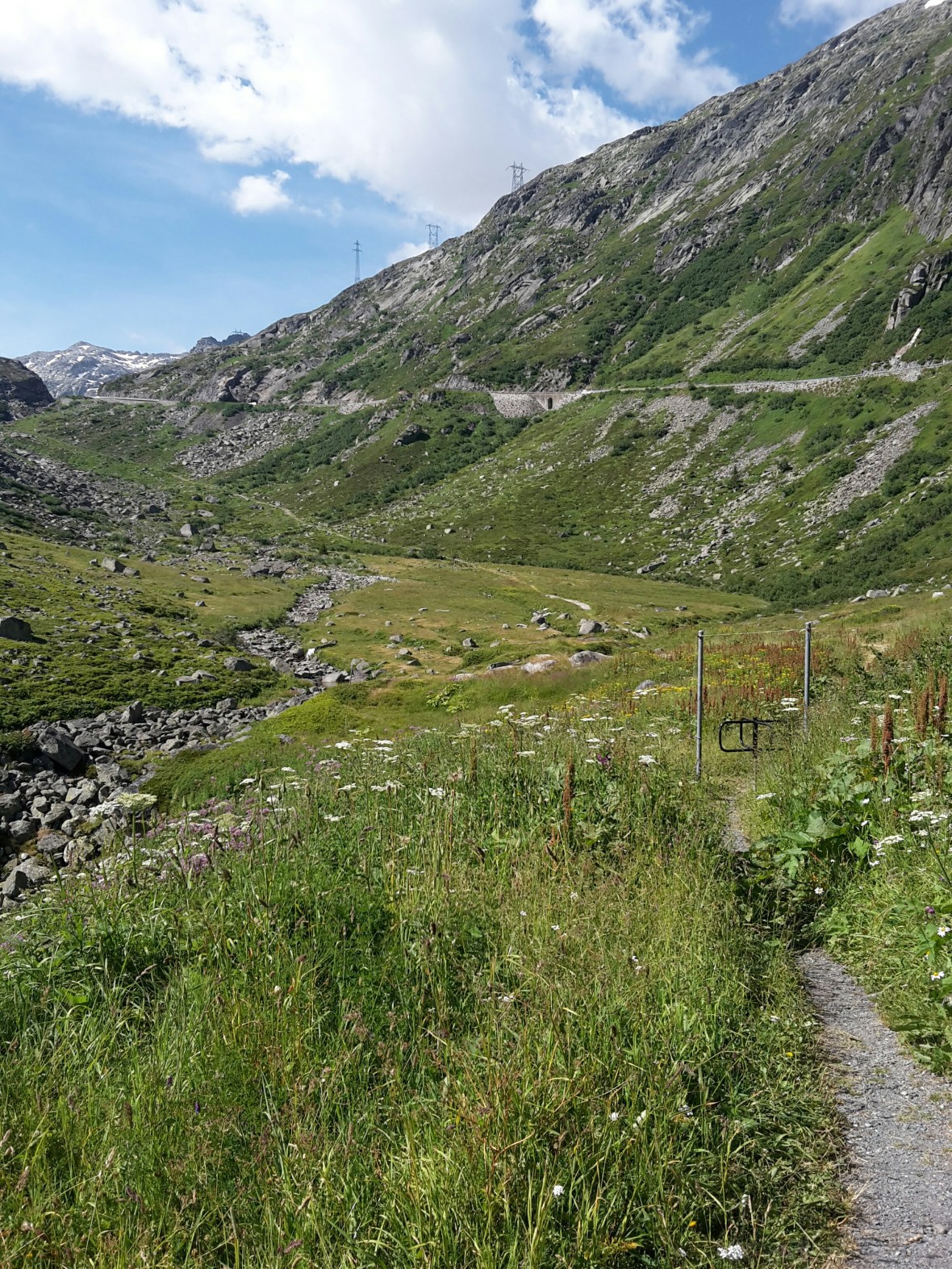 Das Tal weitet sich dann und es geht langsam aber stetig bergauf. Heute gleicht der Weg meistens eher einem Spazierweg. Ich lasse mir Zeit und genieße einfach alles. Ihr seht blauer Himmel, angenehme Temperaturen und intensive Farben. Die Murmeltiere pfeifen, ab und zu zwitschert ein Vogel. Verkehr ist heute sehr wenig. Anfangs begleitet mich noch die Bundesstraße, später rückt sie in weite Ferne und ich bin praktisch allein. Wunderschön!