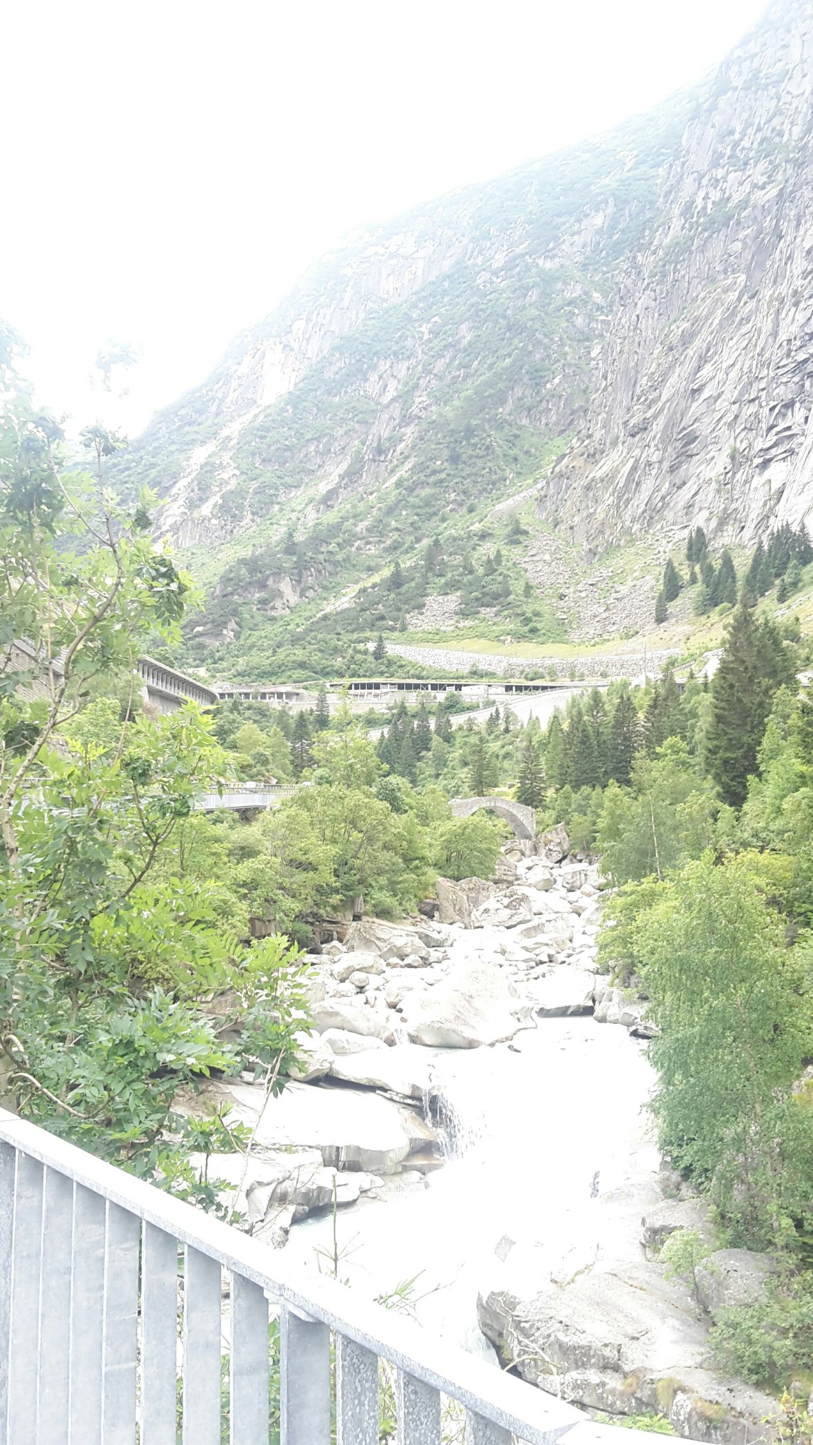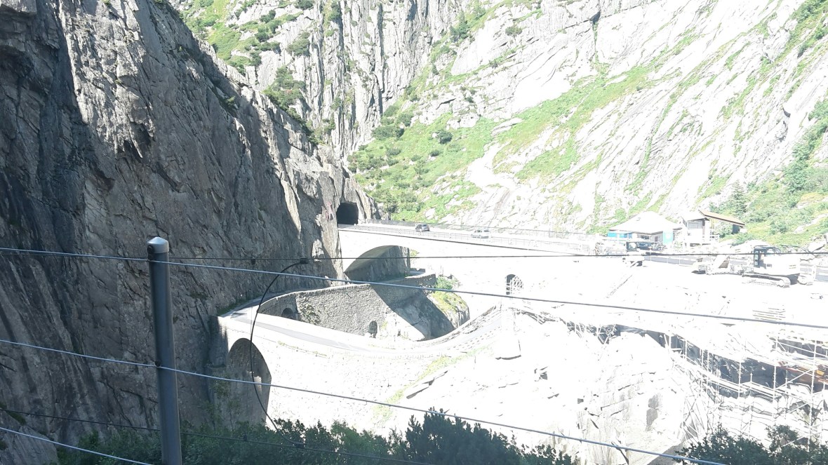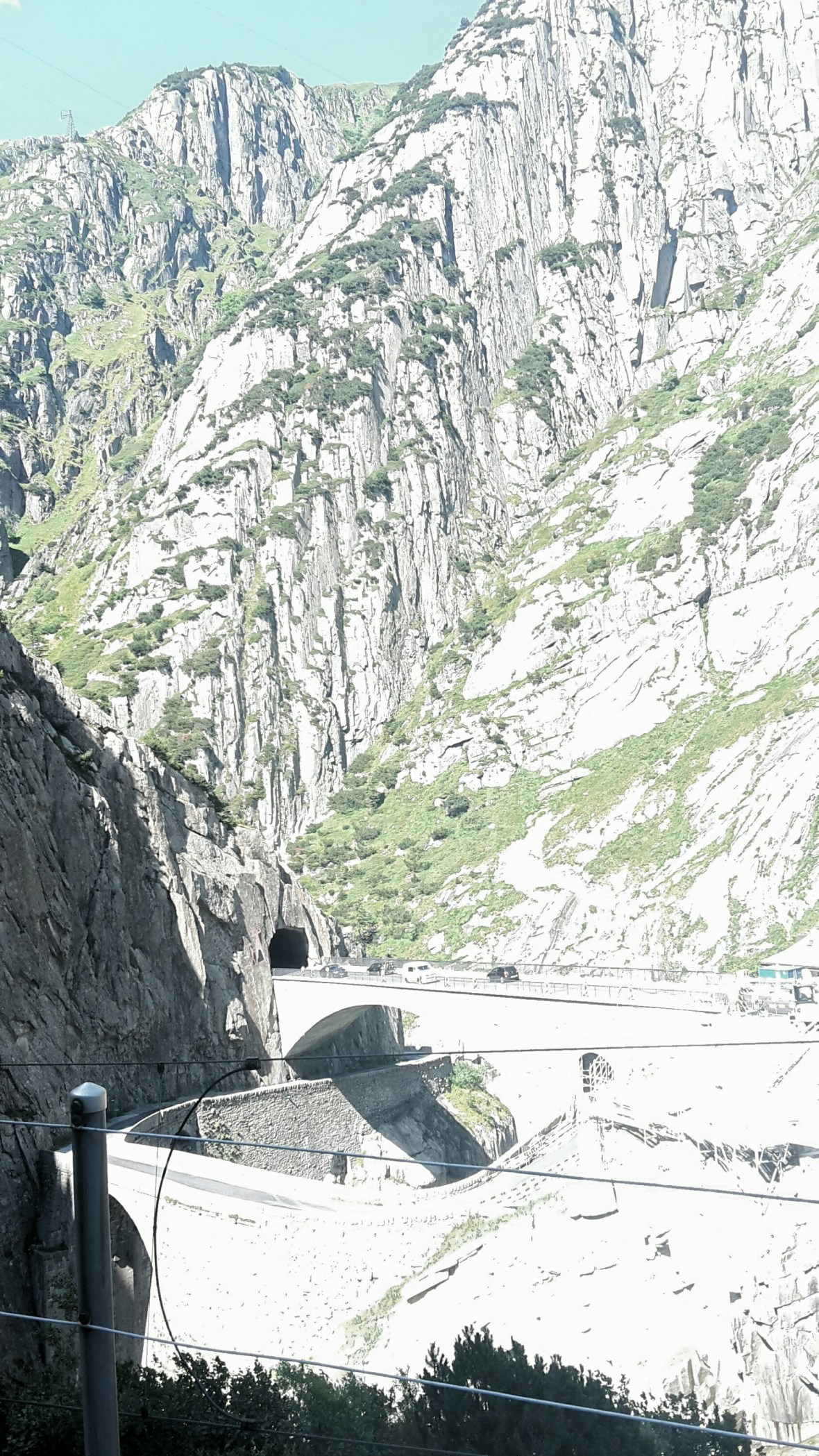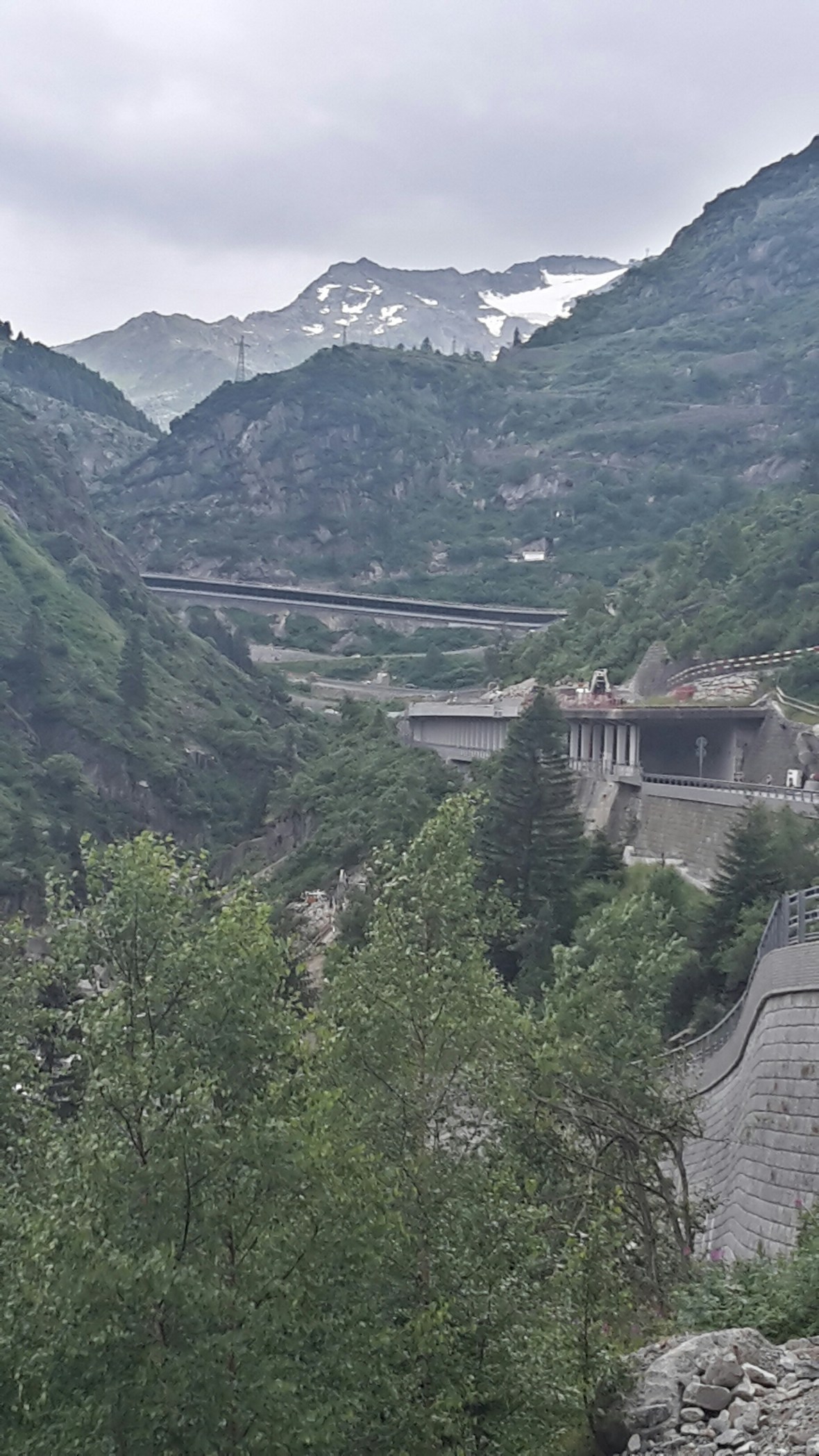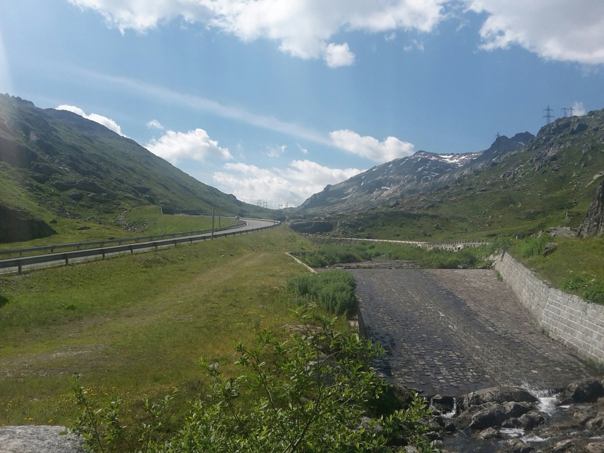 Die Passstrasse hinunter, alles mit Kopfsteinpflaster gepflastert, benutzen scheinbar nur Rennradfahrer und ein paar Cabriobesitzer. Der Rest nimmt die Bundesstraße und ist sofort ausser Sicht. Das Tal ist extrem eng. Der Abstieg herausfordernd, einige Klettereinlagen waren gefragt. Ein Stück war mir dann doch zu gewagt und ich habe die Straße genommen. Wer es nicht gewusst hat, ab der Passhöhe beginnt das Tessin und ab da wird italienisch gesprochen und geschrieben. Immer noch Schweiz und doch ganz anders als vorher, echt verblüffend.