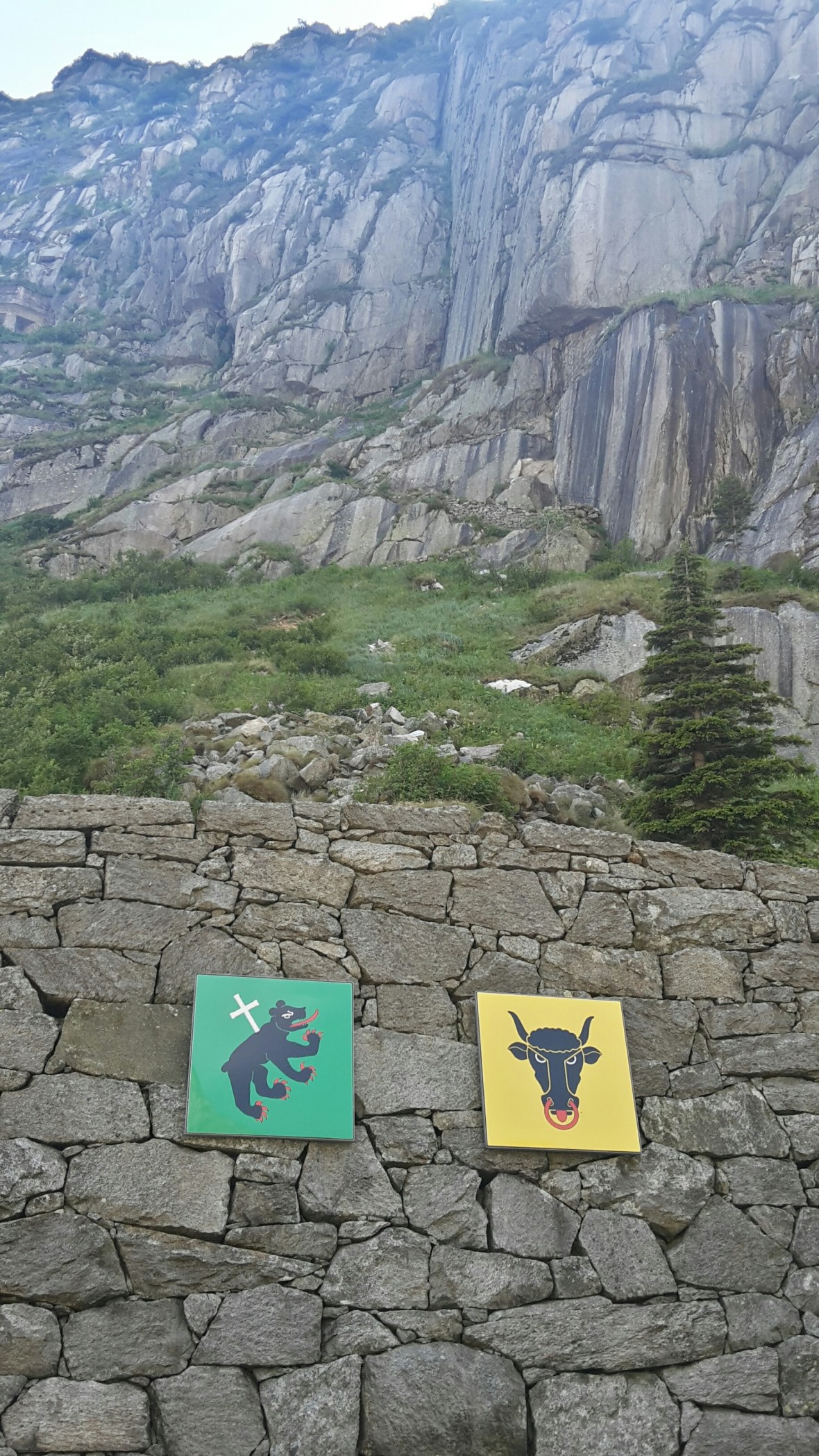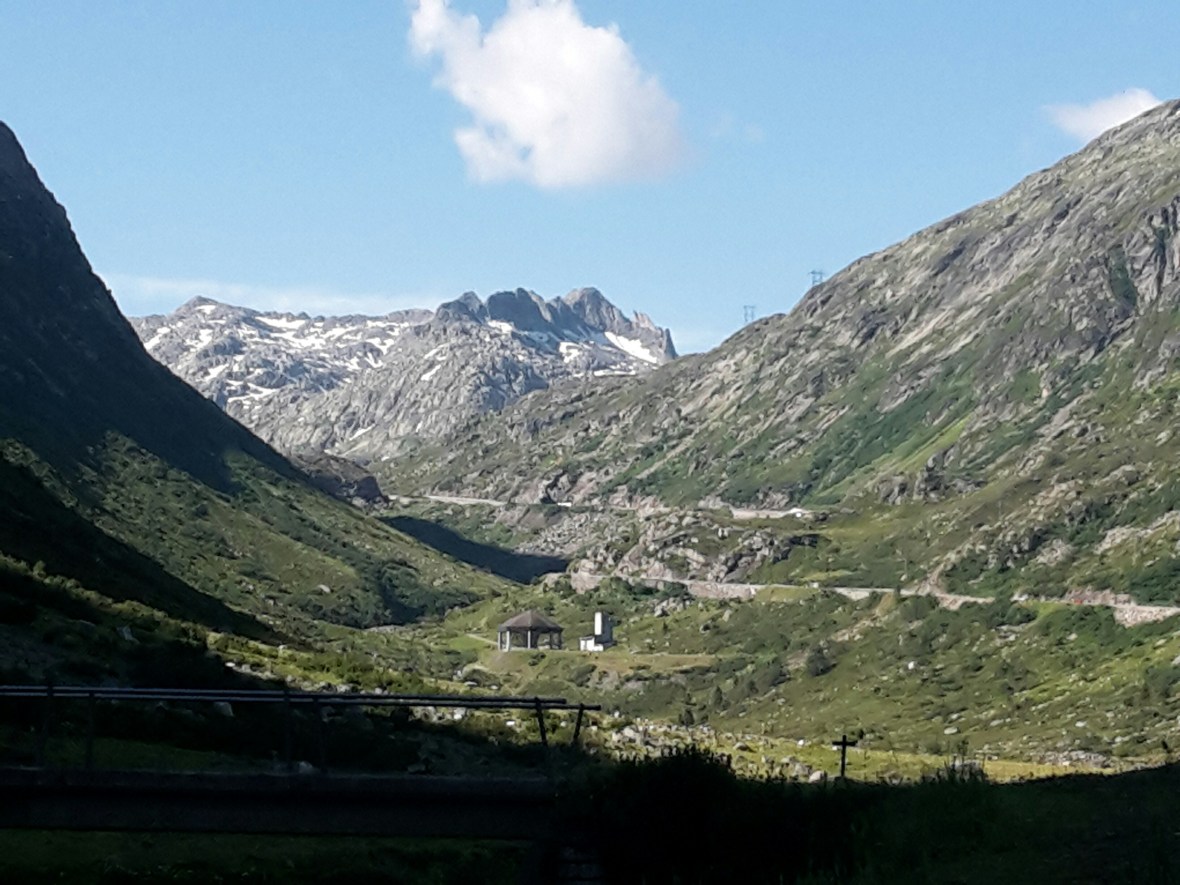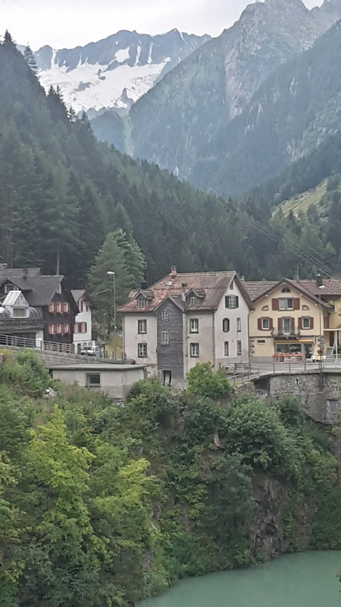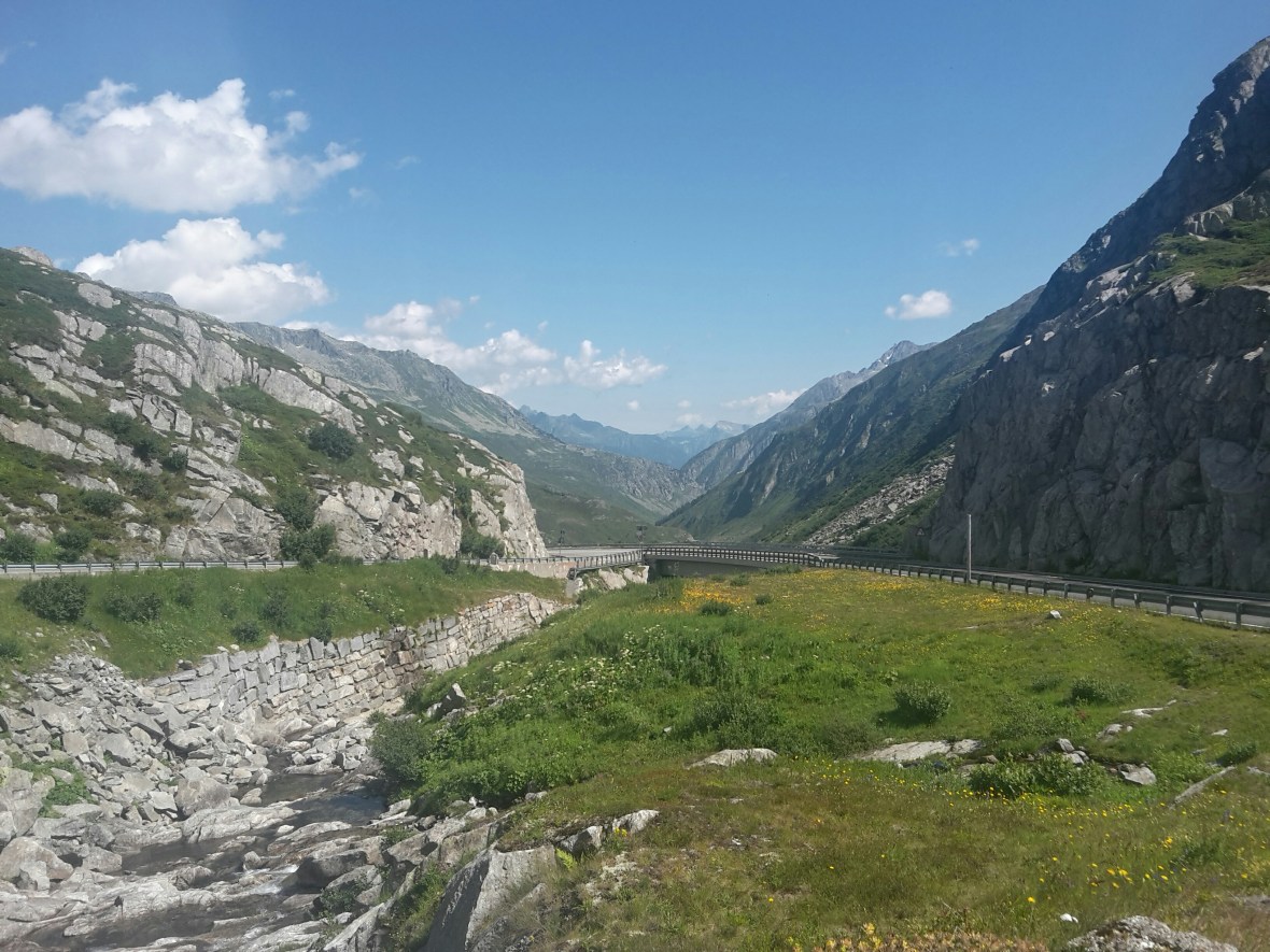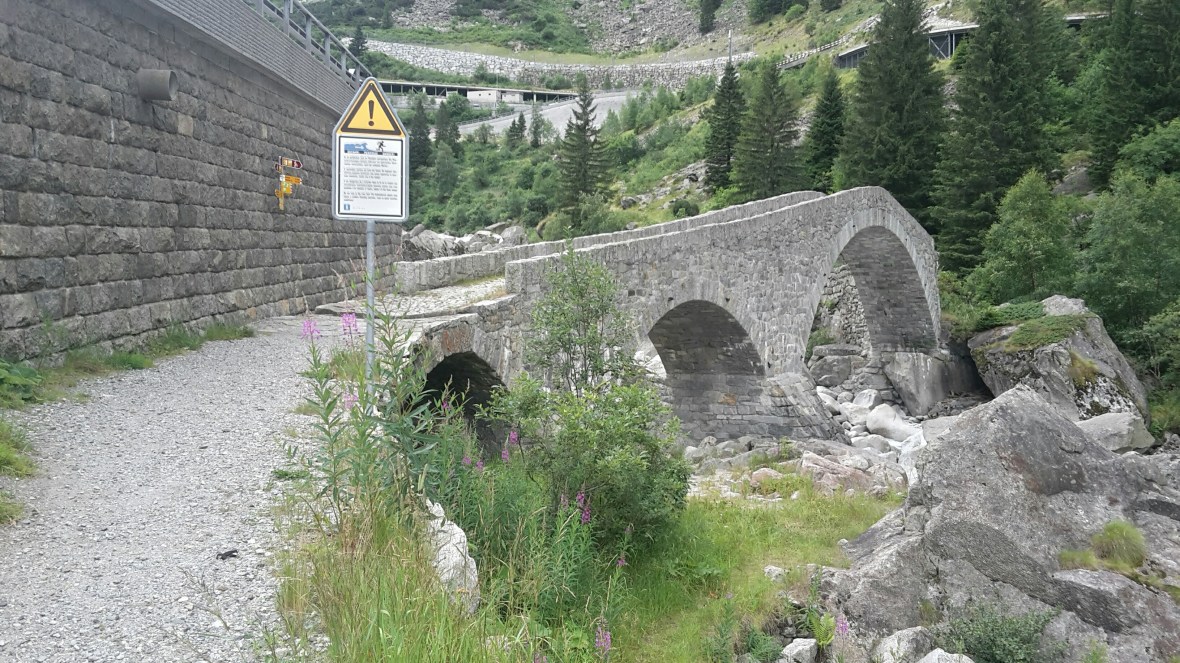 Die Passstrasse hinunter, alles mit Kopfsteinpflaster gepflastert, benutzen scheinbar nur Rennradfahrer und ein paar Cabriobesitzer. Der Rest nimmt die Bundesstraße und ist sofort ausser Sicht. Das Tal ist extrem eng. Der Abstieg herausfordernd, einige Klettereinlagen waren gefragt. Ein Stück war mir dann doch zu gewagt und ich habe die Straße genommen. Wer es nicht gewusst hat, ab der Passhöhe beginnt das Tessin und ab da wird italienisch gesprochen und geschrieben. Immer noch Schweiz und doch ganz anders als vorher, echt verblüffend.