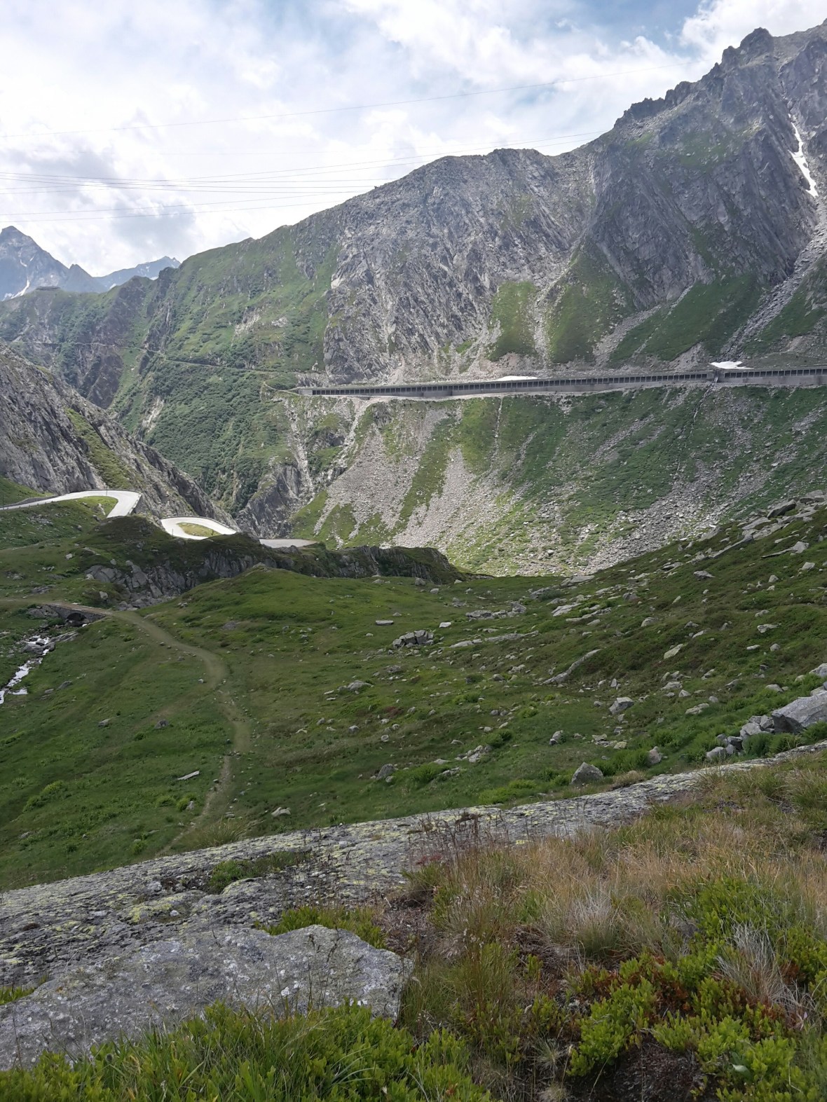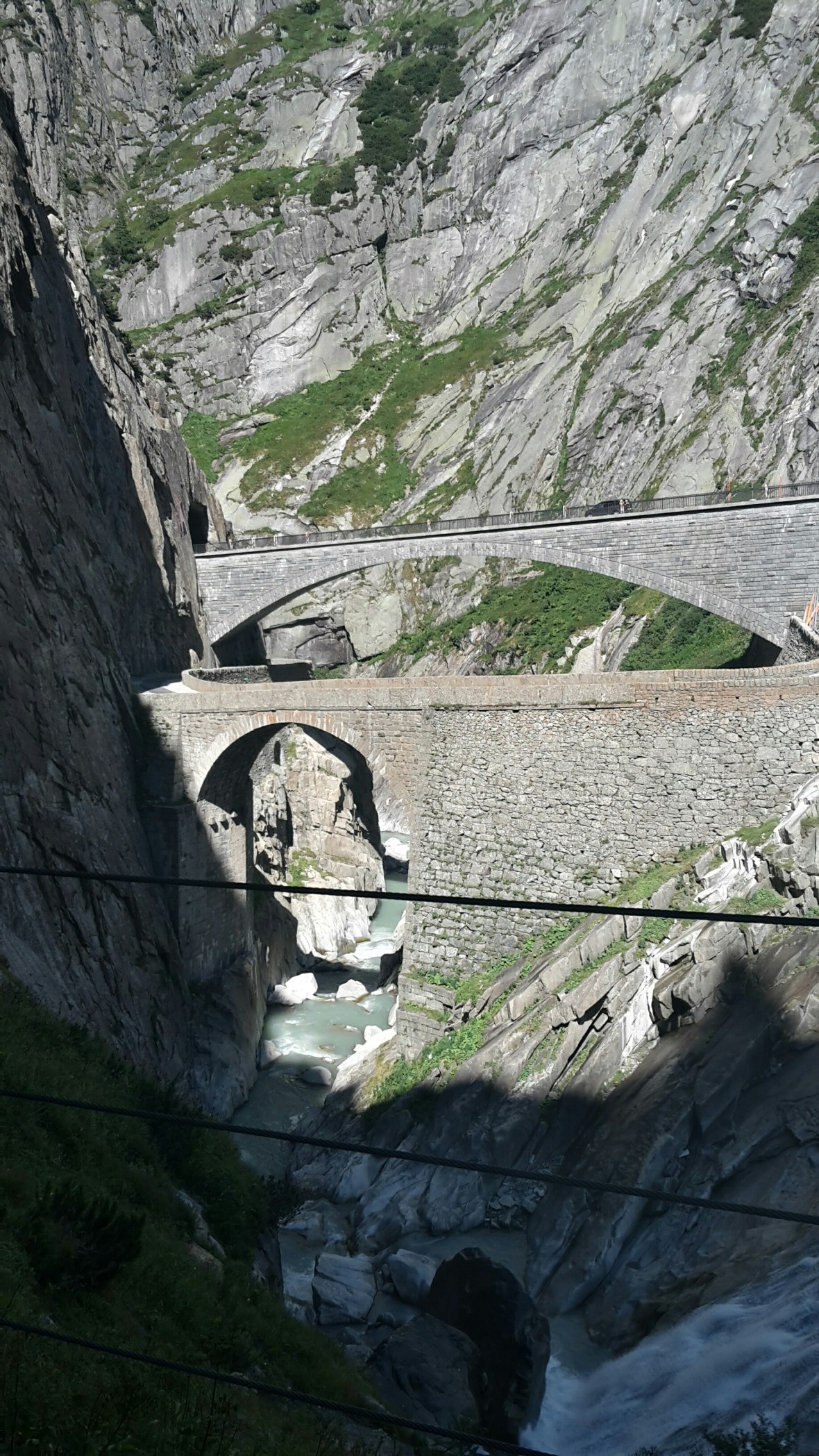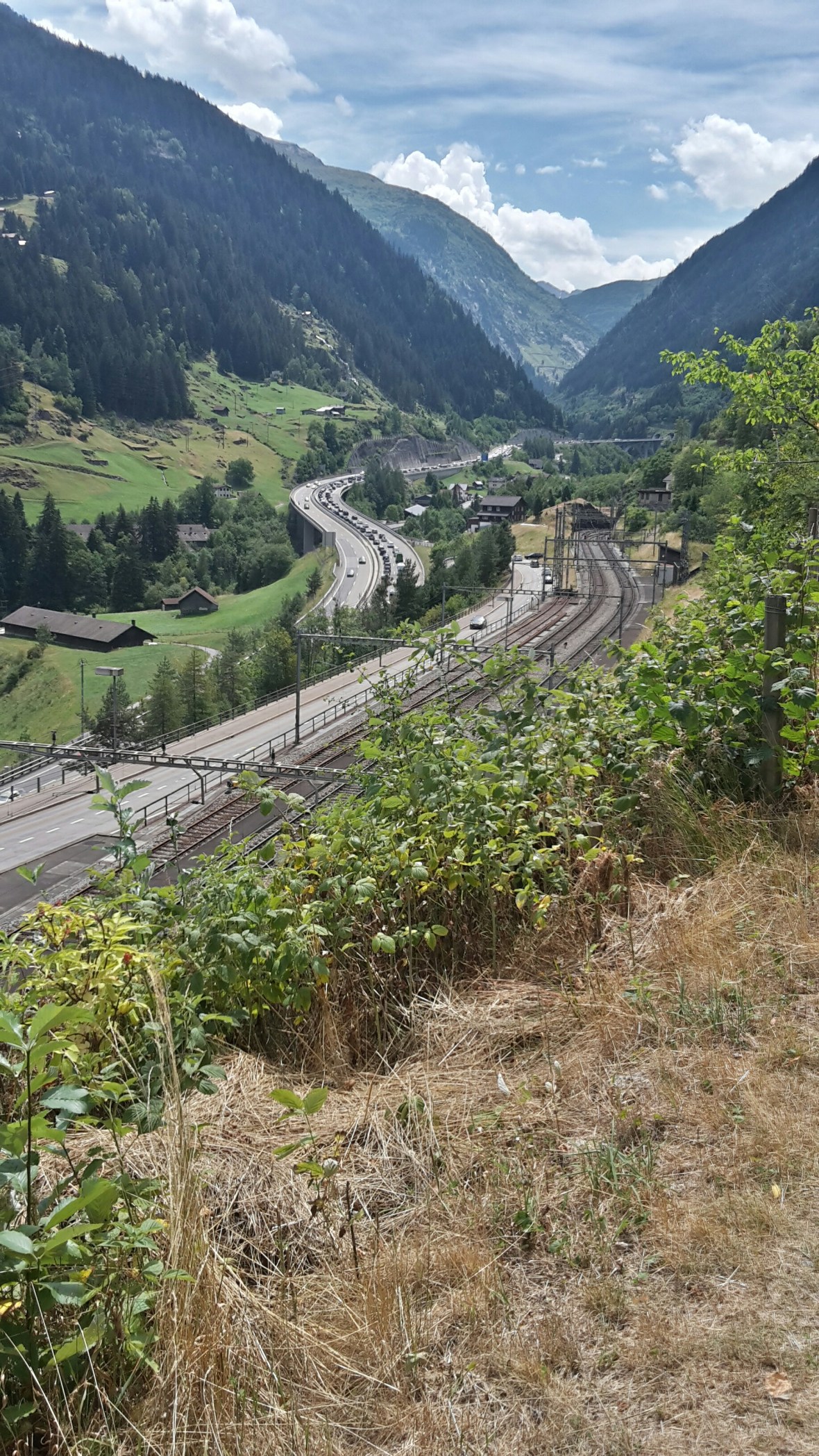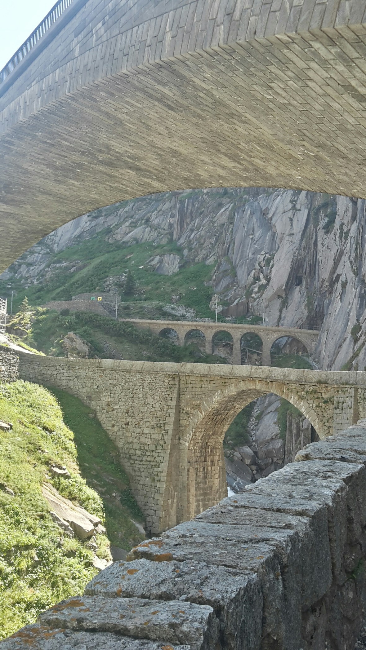 Die Passstrasse hinunter, alles mit Kopfsteinpflaster gepflastert, benutzen scheinbar nur Rennradfahrer und ein paar Cabriobesitzer. Der Rest nimmt die Bundesstraße und ist sofort ausser Sicht. Das Tal ist extrem eng. Der Abstieg herausfordernd, einige Klettereinlagen waren gefragt. Ein Stück war mir dann doch zu gewagt und ich habe die Straße genommen. Wer es nicht gewusst hat, ab der Passhöhe beginnt das Tessin und ab da wird italienisch gesprochen und geschrieben. Immer noch Schweiz und doch ganz anders als vorher, echt verblüffend.
