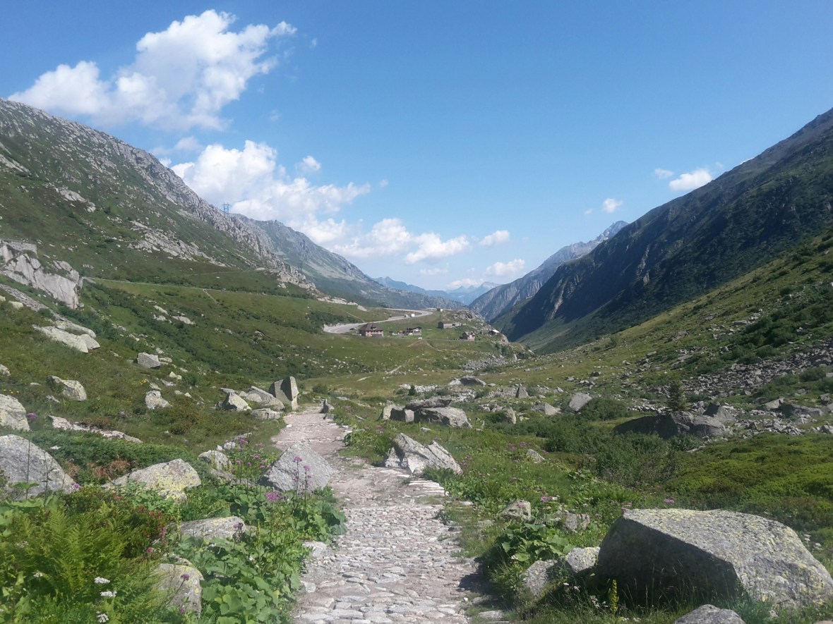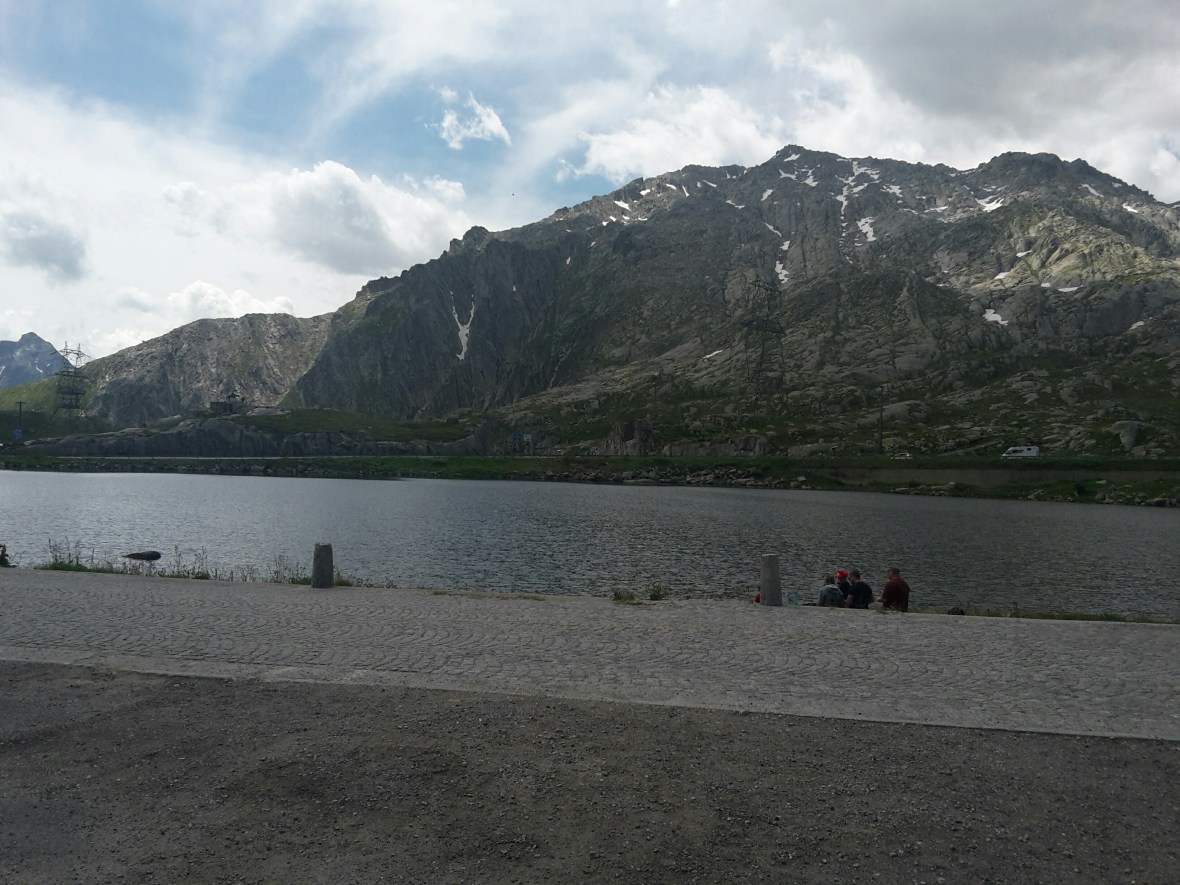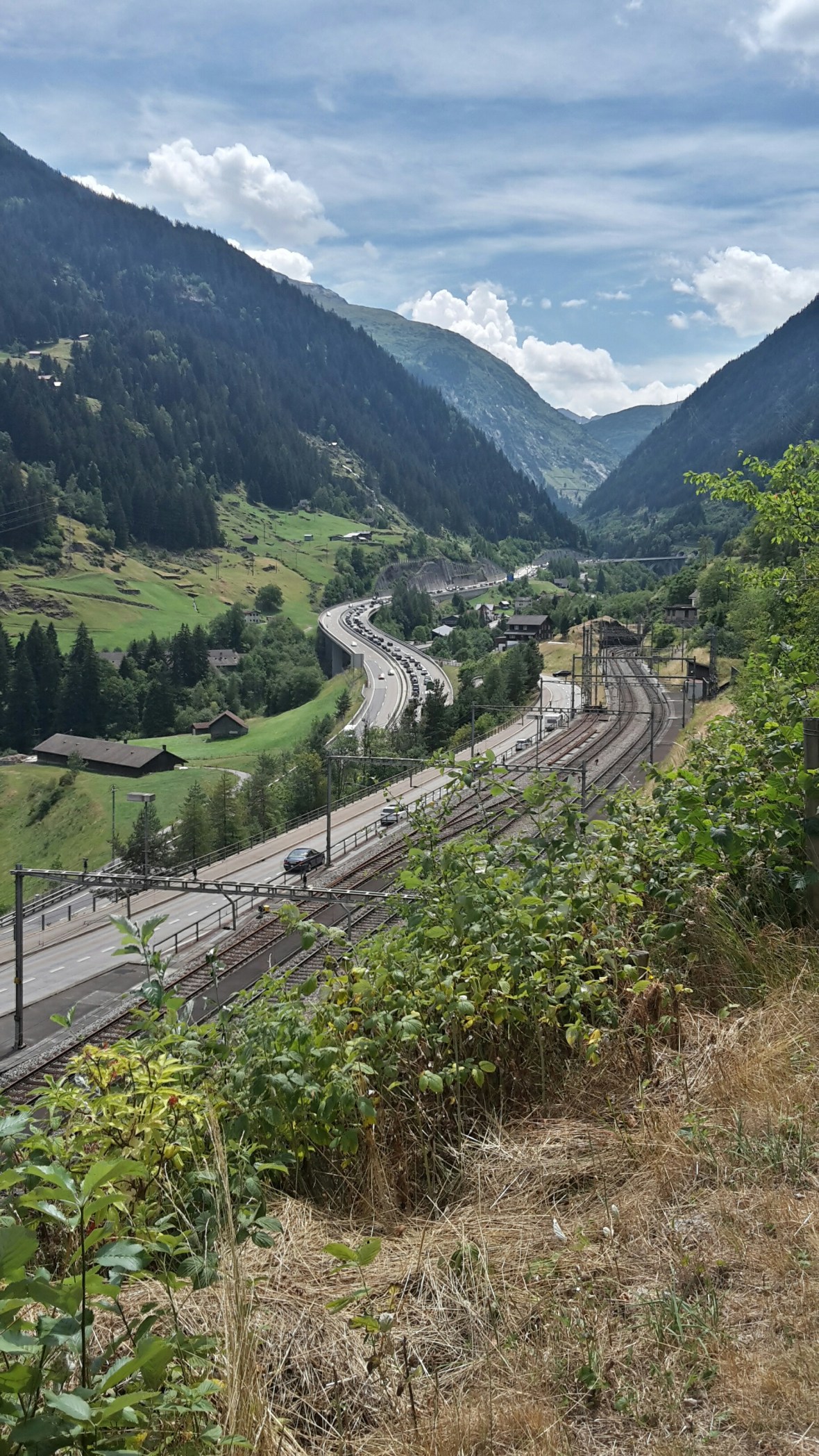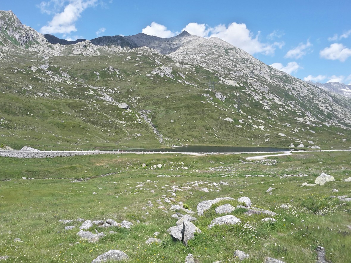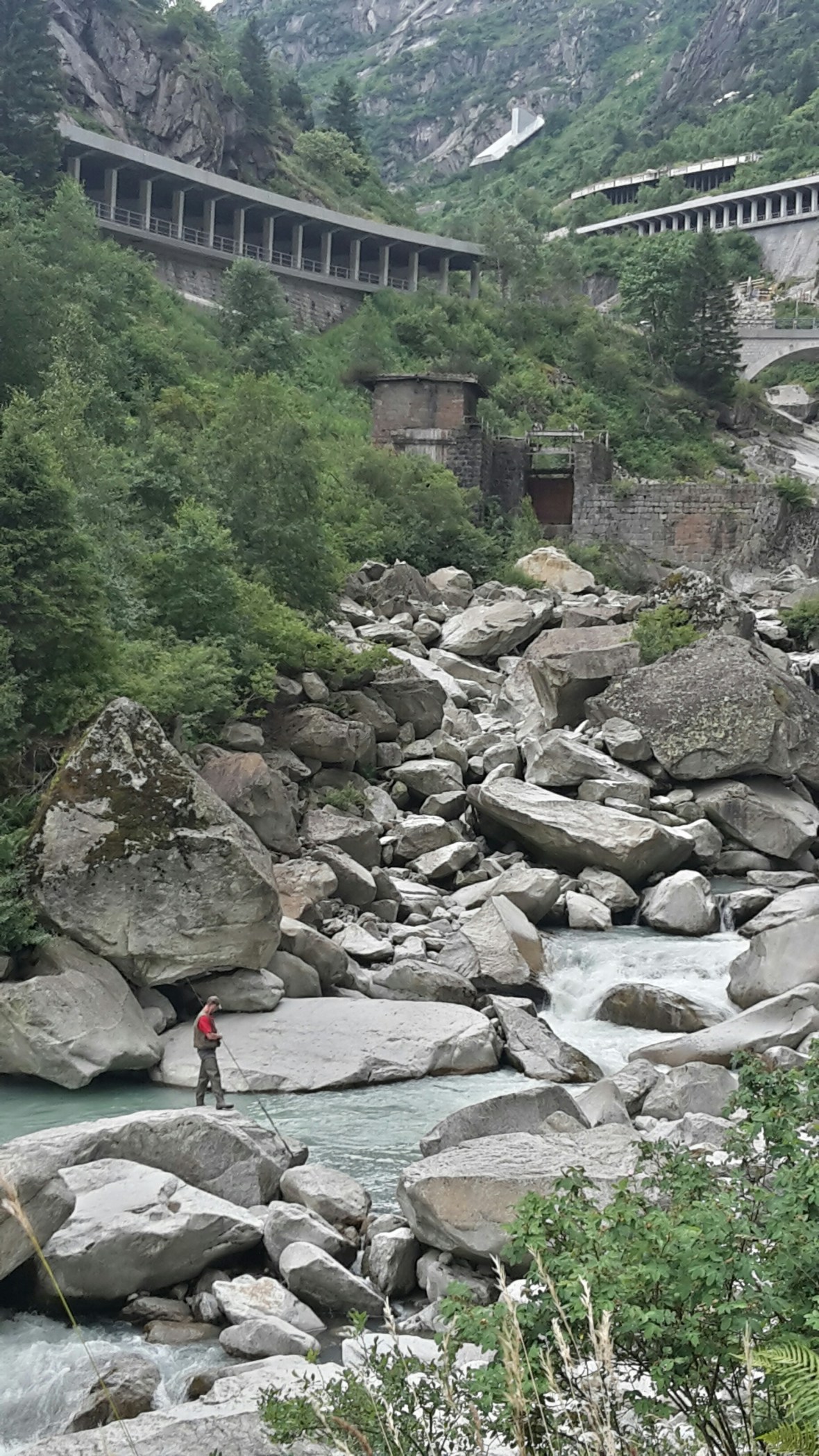 Die Passstrasse hinunter, alles mit Kopfsteinpflaster gepflastert, benutzen scheinbar nur Rennradfahrer und ein paar Cabriobesitzer. Der Rest nimmt die Bundesstraße und ist sofort ausser Sicht. Das Tal ist extrem eng. Der Abstieg herausfordernd, einige Klettereinlagen waren gefragt. Ein Stück war mir dann doch zu gewagt und ich habe die Straße genommen. Wer es nicht gewusst hat, ab der Passhöhe beginnt das Tessin und ab da wird italienisch gesprochen und geschrieben. Immer noch Schweiz und doch ganz anders als vorher, echt verblüffend.
