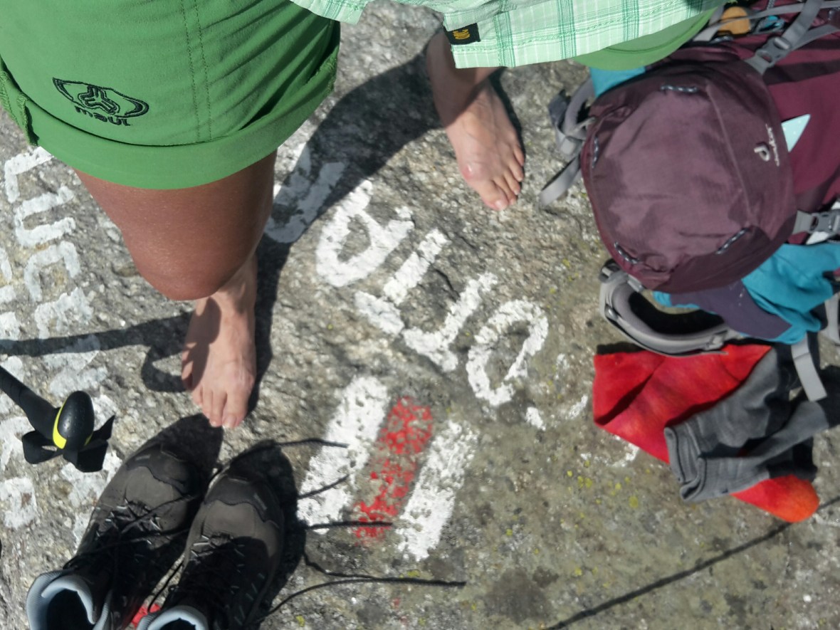 Diesen Stein hat keiner beachtet, wo er doch sozusagen der Scheidepunkt war direkt beim Wegweiser und somit der Gipfel. Alle mussten Fotos von sich und den Kühen, die da weideten, knipsen. So ist ein Bild zustande gekommen,