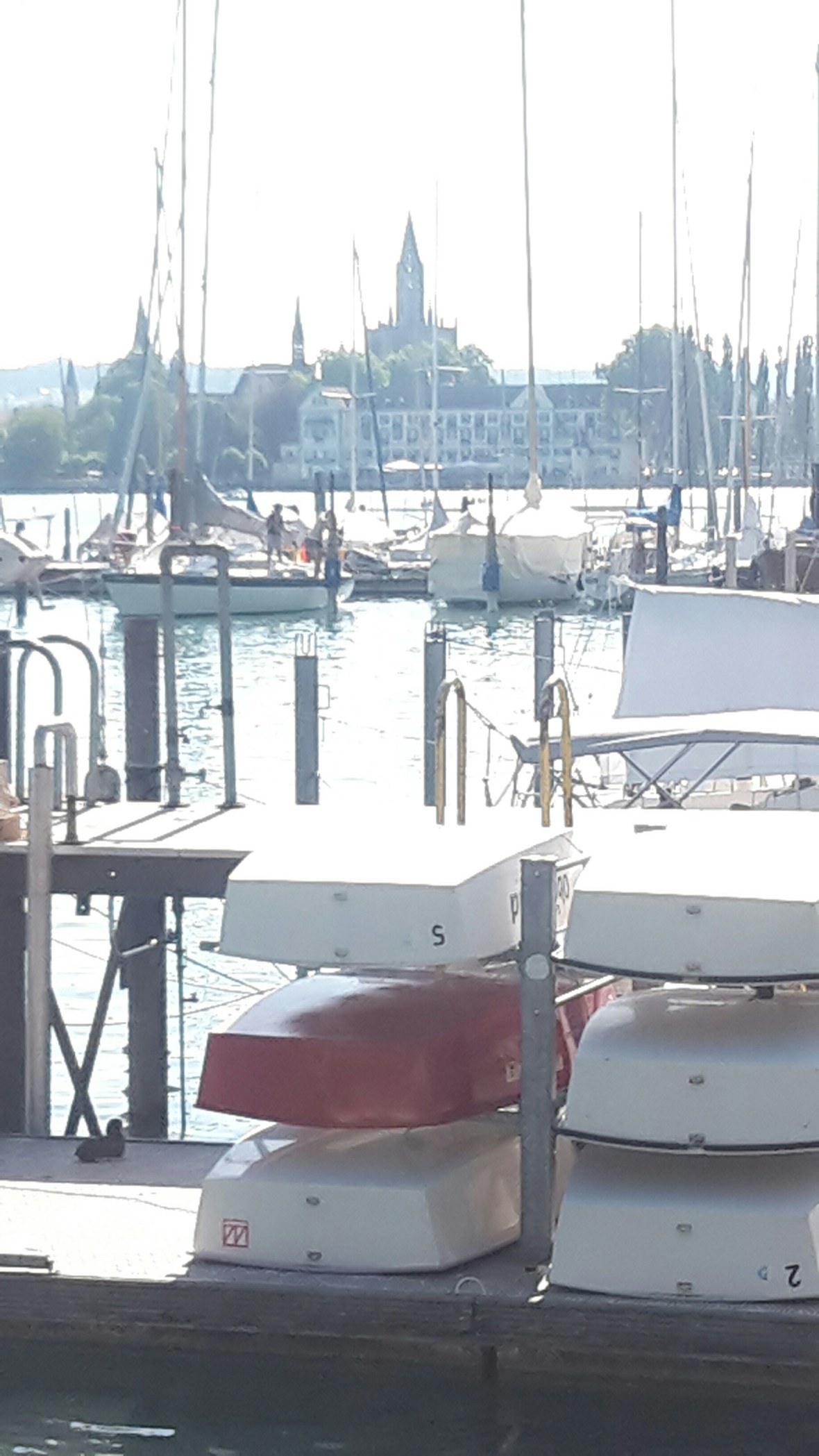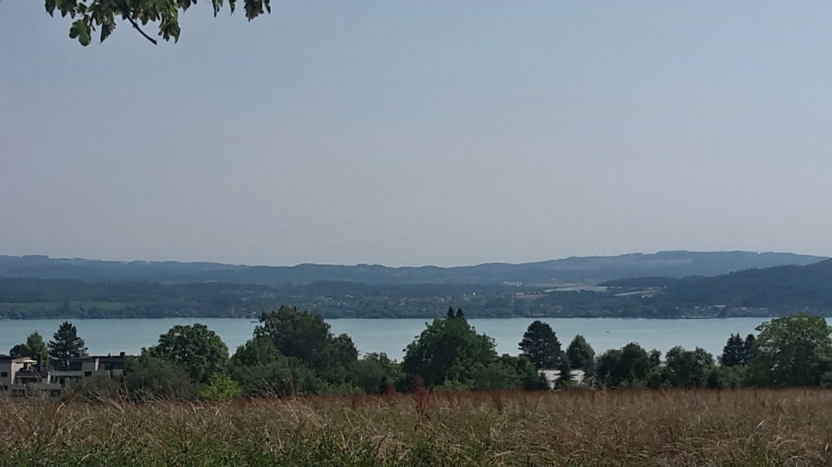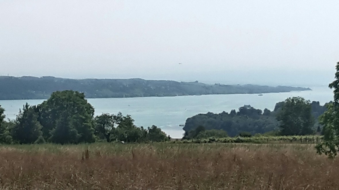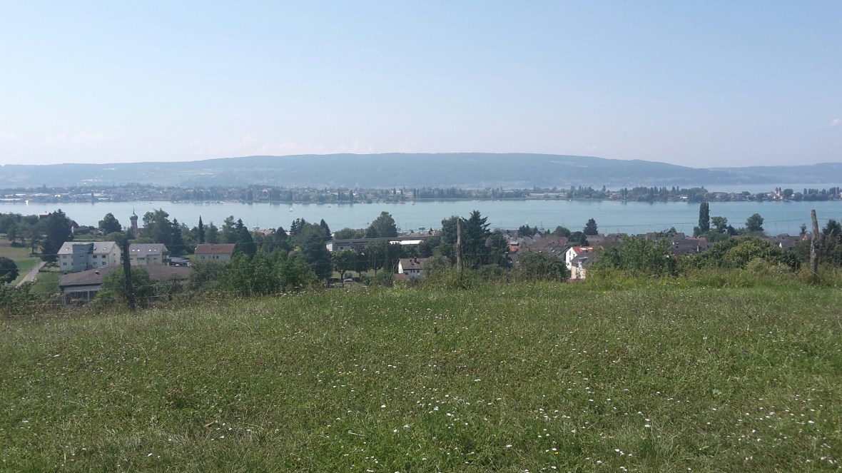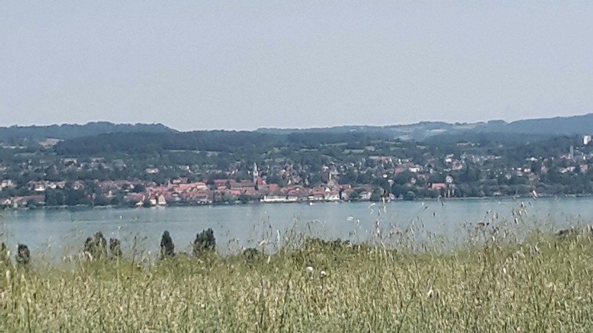 Allgemeiner!Aufbruch am Montag in der Früh. Der Urlaub geht zu Ende. Die fahren nach Hause und wandere gleich von Konstanz aus, sozusagen zurück. Ich habe ja mit der Zugfahrt einige Etappen überspringen. Jetzt laufe ich halt von Ost nach West bis ich wieder bei der Schattenmühle ankomme und dann geht’s halt nochmals mit dem Zug nach Konstanz . Ein extrem heißer Tag und die Wasserflasche war mein bester Freund. Der Weg führte oberhalb des Bodensees entlang. Für uns ist ja das ganze Gebilde der Bodensee, aber eigentlich besteht das Gewässer aus mehreren Seen mit eigenen Namen. Hier der Blick von oberhalb Litzelstettens auf den See.