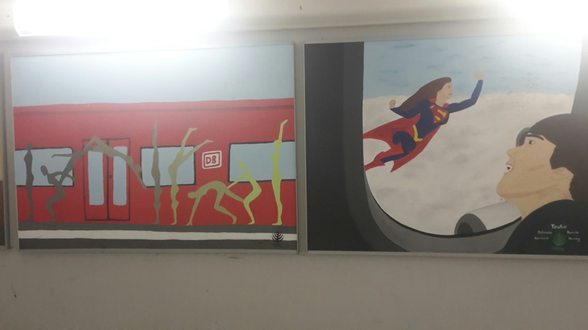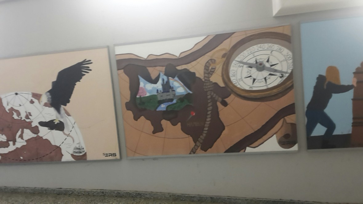 Ganz gemütlich und bequem begann der Tag wieder einmal mit einer Zugfahrt. Dieses Mal von Hameln nach Altenbeken. Das ist immer noch das Einzugsgebiet der SBahn Hannover. Die Bahnhofspasssage, die ja meistens eine eher schmuddelige Angelegenheit sind, sind in Hameln mit großen gemalten Bildern gestaltet. Sie haben alle etwas mit dem Begriff Reisen zu tun.